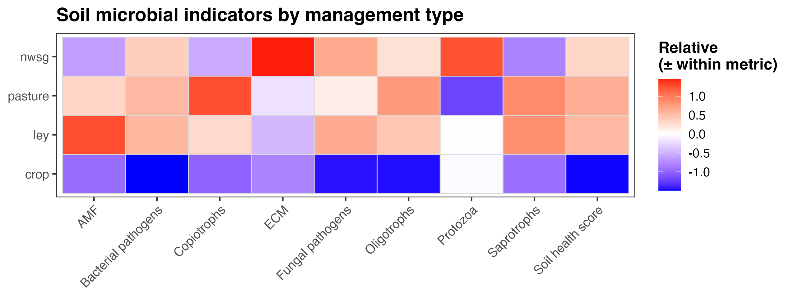 Figure 14. Heatmap of soil microbial indicators, including an overall soil health score, summarized by management type. Values represent relative, standardized deviations within each metric (mean-centered and scaled), allowing comparison of patterns across management systems rather than absolute magnitudes. Colors indicate higher (red) or lower (blue) values relative to the overall mean for each indicator. Management types include crop fields, ley rotations, native warm-season grass establishment (NWSG), and cool-season pastures. Note that the color scheme for bacterial pathogens, fungal pathogens, and Copiotrophs is flipped compared to the other categories, as higher abundance of these three functional groups indicate lower soil health and increased disturbance ecologies. Note also that the pathogen categories indicate risk only, as in many cases the taxonomic assignments weren't able to distinguish between pathogenic species/strains and ones that might be neutral or even beneficial.