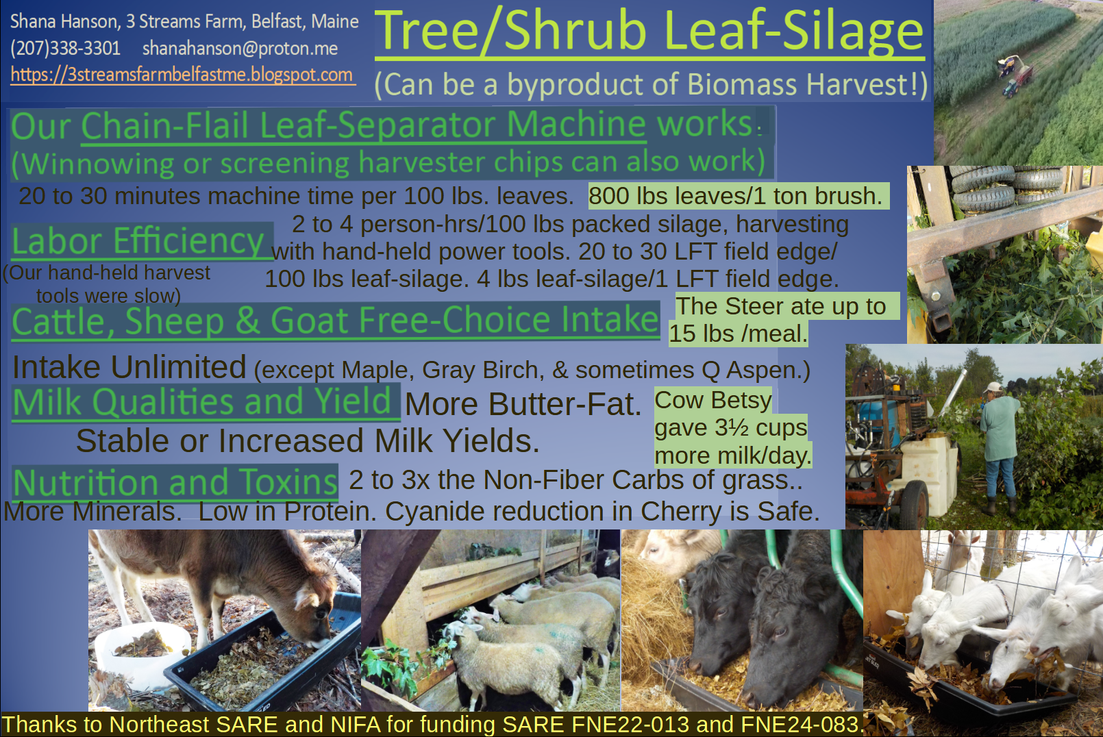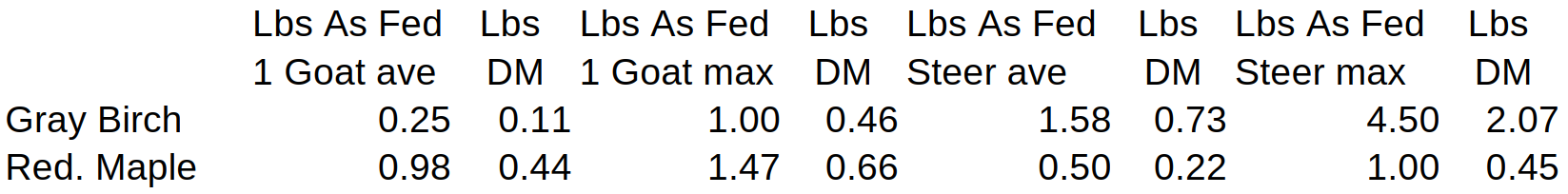 Cattle generlly eat 12% Dry Matter (DM) of woody browse, sheep 20% and goats 60% (Lindsay Whistance, 12/10/21 Silvopasture webinar hosted by Steve Gabriel, Wellspring Forest Farm); my steer Angelo in SARE FNE22-013, with unlimited access to that low-quality 2023 late-cut hay, consistently chose tree/shrub leaf-silage as 33% DM of his (grain-free, forage only) diet across three separate 11-day periods of one 2 hour offering-period/day. Angelo kicked up his heels to gallop to it (he only trotted quickly for the alternate-period offerings of 2nd-cut hay); I did not weigh him, but he outgrew draft tack and looked great all winter.