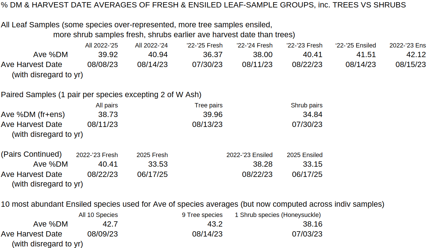 Usable Northeastern Nutritional Data: Our data will suffice to guide farmer rationing experimenttion with most common species of Northeastern leaf-silage, and fresh leaves as well. Trends are clear for well-known nutritional components. We still lack full understanding of intricate plant/animal antifeedant and medicinal chemical interactions, which we think strongly affect animal selectivity and intake of these deeply rooted, complex plants.