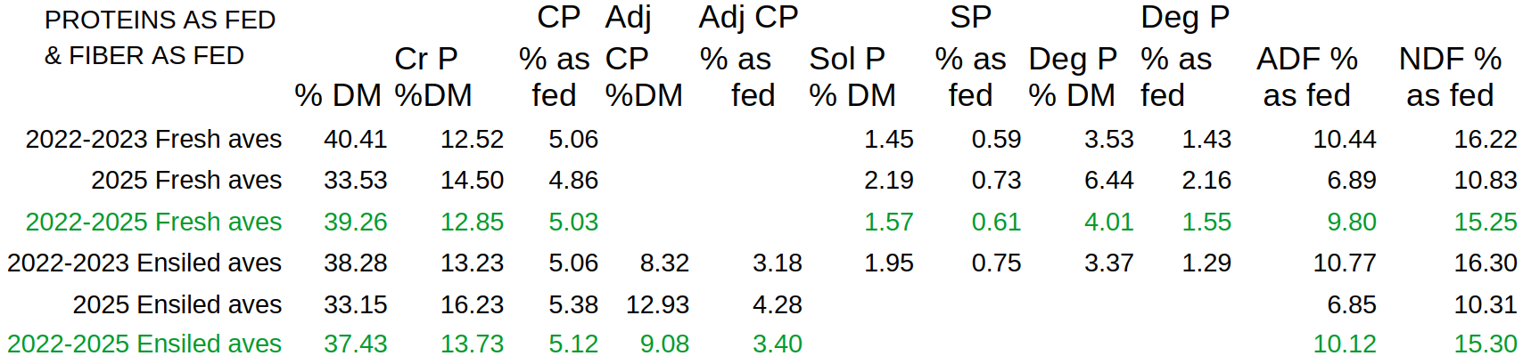 Harvest-date comparisons were confounded by differing quality of 3 sites harvested consecutively (see 2 “Harvest-date” spreadsheets under “Results”). Earlier-harvested 2025 samples did show the expected trend of higher protein and lower energy % of DM than later-harvested 2022-’24 samples, with less pronounced difference in levels as fed (versus DM).