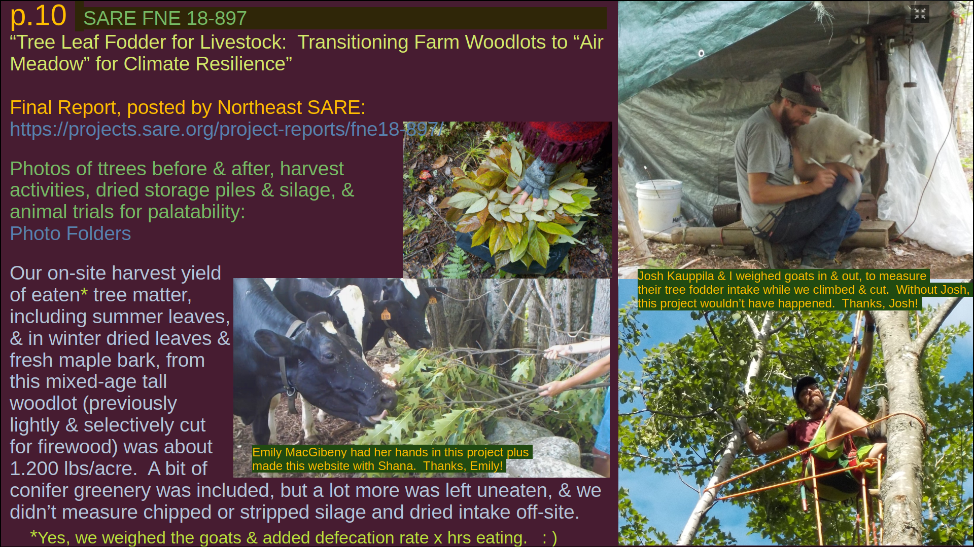 At this point, even before further resaearch, grass-fed ruminant farmers (such as myself), and all goat farmers , can especially benefit from tree/shrub use, especially when climate challenges reduce quantity or quality of grass harvests. Northeastern farms will find our regionally-limited data to be most pertinent to their farm resources, but some nutritional parameters may apply to broadleaf trees in general. Mid-sized and large farms probably need to develop tree-lines for machine-harvest along with compatible harvest equipment, to implement scale-appropriate leaf-silage harvests and make use of my data (except at Wolfe’s Neck Center, where the cattle staff are especially enthusiastic and undaunted by manual labor). This all takes time (and expenditures), but that is true of any change in practice. Small Northeastern farms, including most Maine goat and sheep farms, are already able to use our information to beneficially ration leaf-forages.