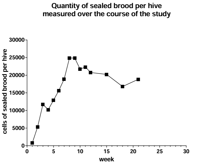 Development of the remaining 26 hives progressed, as evidenced by their production of sealed brood (Figure 1), which peaked at about 25,000 cells of sealed brood at weeks 7-8 (the first half of June). The amount of sealed brood measured in the hives was slightly less (about 20,000 cells of sealed brood) in the latter part of the study.