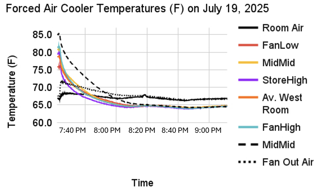 Mid/Mid temperatures on both sides of the cooler started higher than the other locations. This makes sense since the mid/mid bins would have the least exterior surface area for ventilation and cooling while waiting for the cooler fan to startup. The starting temperatures on both sides of the cooler followed the same pattern (from highest to lowest). Mid/Mid was warmest to start, then Store/South end was next warmest, and Fan/North end is coolest to start. One of two heat pumps was directly over the fan (north side) of the forced air cooler so that end may have had more exposure to cooler air. Window/East side of the cooler started at higher temperatures compared to the Room/West side of the cooler even though the loading was done symmetrically. The last carts added were in the center, which were not instrumented.