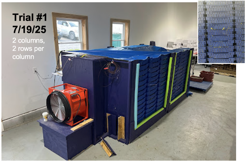 A second trial was conducted the following day, 7/20/25, with 4 U-boats in a 2x4 arrangement. The team worked to better seal the large gaps noted around the plenum/U-boat connections. The intent was to maximize the air flow through the vent slats of the harvest bins and, thus, through the berries. Boxboard and 6 mil poly film were used to seal open gaps.