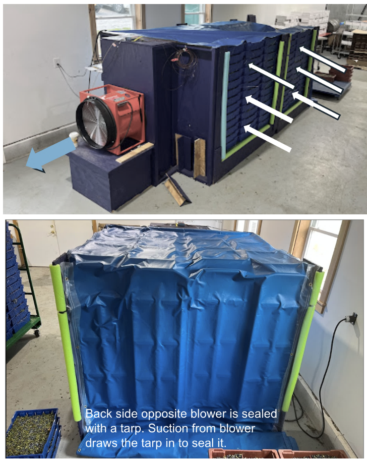 A forced-air cooling tunnel was constructed within Brodis Blueberries’ existing packing facility using a plywood plenum and rolling carts (U-boats) as the primary structural support. Harvest bins containing freshly harvested wild blueberries were stacked in two parallel rows on the carts, creating a central airflow tunnel approximately 16–24 inches wide. The tunnel was enclosed a large with vinyl-coated tarp and pool noodles to minimize air leakage and ensure that airflow was directed through the ventilated harvest bins.