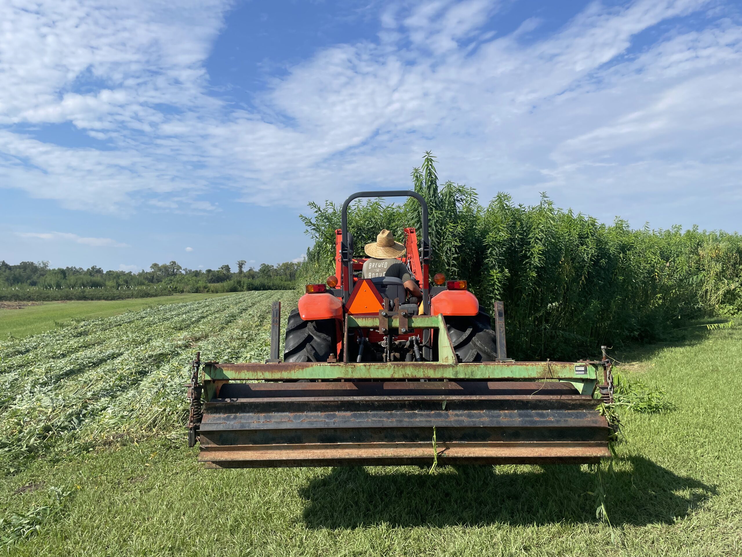 To date we have hosted one on-farm Field Day in June 2023 and were panelists in a conference session on cover crops. We will be hosting our second Field Day on April 3, 2024. At our on-farm Field Day last June, in collaboration with Sprout NOLA, we hosted a group of 15 growers and local ag agents and showed them the areas on our farm that had just been seeded with sunn hemp. We also crimped a stand of sunn hemp that had been seeded two months prior. We discussed our plans for this project and talked about how crimped sunn hemp could be implemented on different scales.