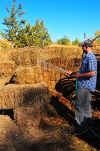 We built the new heater on October 15, 2016 (see Photos 1-30 below), incorporating the new design features (Table 1). The pile’s dimensions are 20’ diameter and 6’ high, including the wall of insulating hay bales. Internal to the insulating layer, the pile is 17.5’ diameter. The pile consists of a mix of hardwood chips (75%), horse manure (20%), and sawdust (5%) (Photo 11). These three materials were mixed thoroughly by a skid steer immediately prior to construction of the pile. During this mixing, the materials were thoroughly wetted for four hours, using two garden hoses (Photos 9-10). This process of thoroughly mixing and wetting the materials, which was not performed in the building of the first pile in 2015, is thought by us to be the primary cause of the sustained heat of the 2016 compost heater.