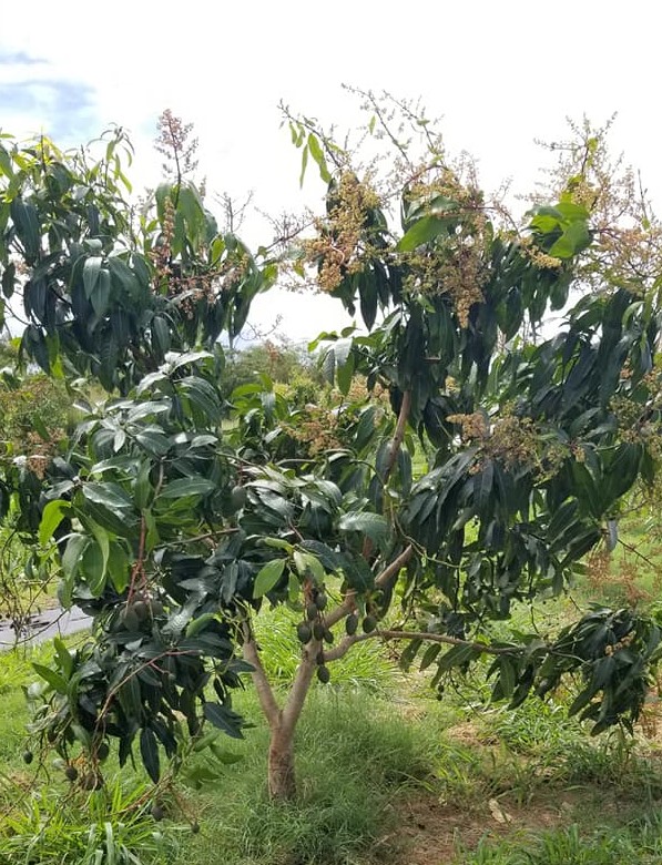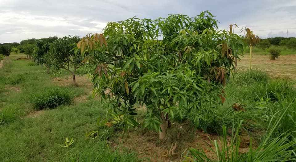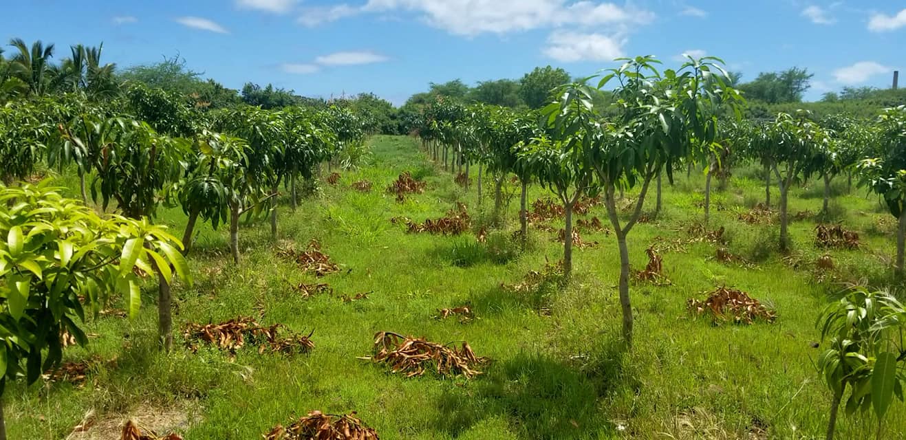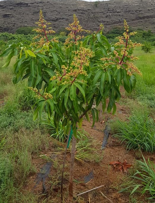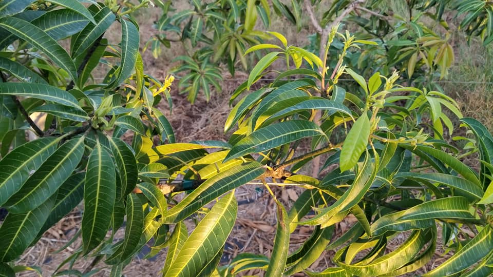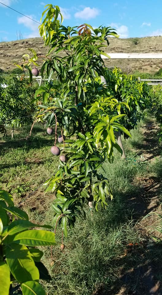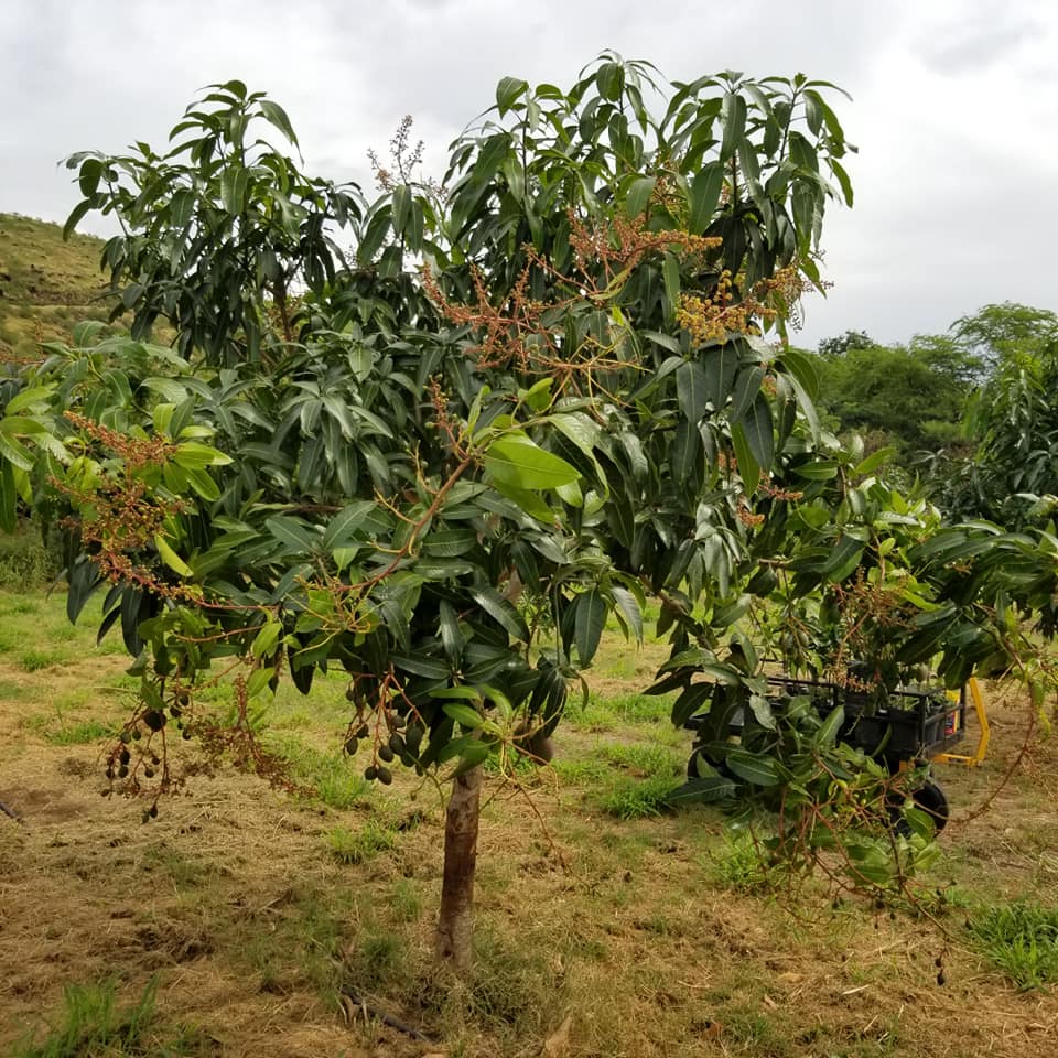 Year Three : Ultra High Density Plantation (UHDP) The uhdp field was planted between November 2017 to May 2018, so the trees have been in the ground from 30 to 36 months. At this point, 200 trees are at the desired height and size and are ready to bear fruit; another 50 trees are shorter or have a less developed canopy, but are still going to be allowed to flower and fruit; and another 50 trees are not ready to bear fruit. The trees that are not ready for fruiting are younger trees that have replaced dead trees, or have been damaged and need to regrow its' canopy. The trees that are full size are now managed according to its' growth cycle. One major pruning, to reduce the size of the tree is conducted directly following harvest. It takes 5 to 6 minutes per tree to prune and tip and this is an opportunity to apply nutrients. Mango trees have a short dormancy, usually in early winter, followed by a flush of flowers. This is another moment to apply nutrients important to flowering and fruiting, and fungicides to protect against Powdery mildew and Anthracnose. Harvest begins in the Summer through the Fall depending on the variety or when it flowered, and takes 6 to 8 weeks. Here is a video on the third year, and here.