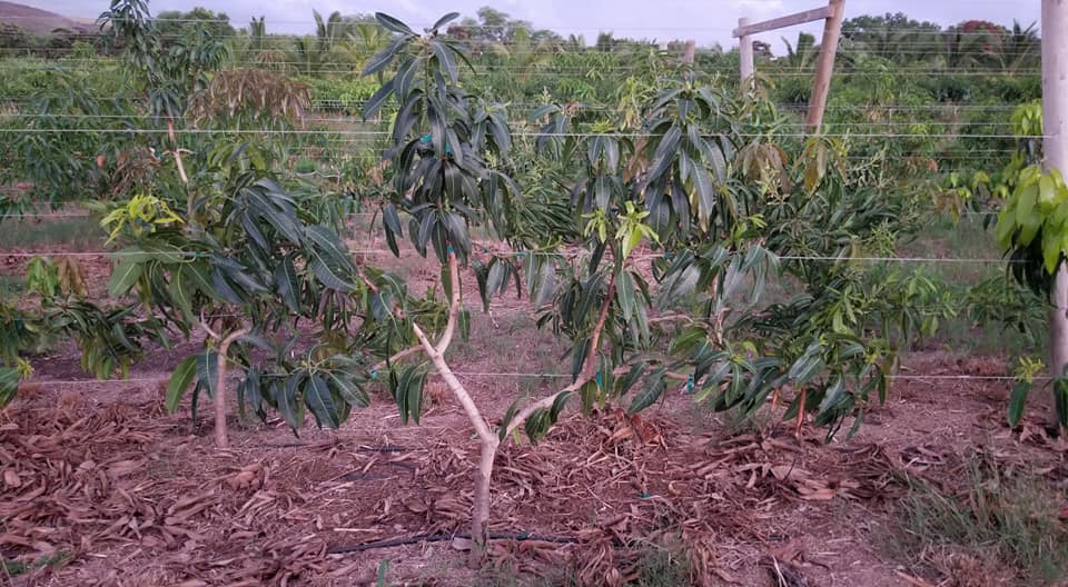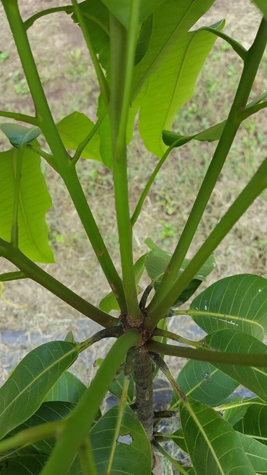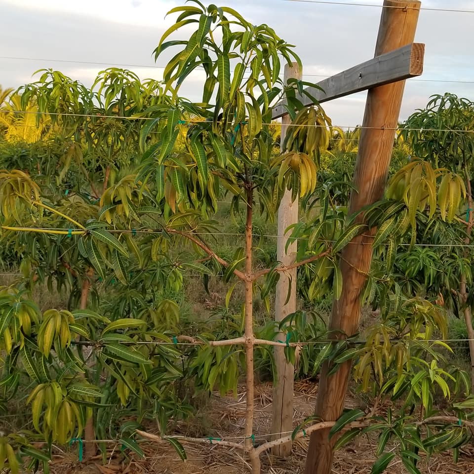 Different varieties have different growth habits. Some trees, like White pirie, often flushes new leaves with a whorl of shoots, anywhere from 2 to 10 shoots. This allows you to train the trees vertically and laterally at the same time and will fill in the space quicker. Keitt is a vigorous upright growing tree that flushes off of the terminal shoot and doesn't have the whorl of shoots. because of this, you have to train the lateral growth independently from the vertical growth by removing the terminal shoot to force the whorl of shoots to emerge. This will take longer to train the trees. Nom dok mai is a small slow growing tree, growing at half the rate of the other trees. The branch nodes are thicker, less pliable, and will break if forced to go where it doesn't want to. Training this tree into the fan shape is more natural than the central leader design, with less time loss trying to replace broken branches.