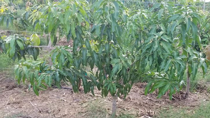 The mango tree is a sub-tropical evergreen tree that is widely dispersed throughout the tropics. The trees are long lived, often over 100 years while still producing fruit. If left unpruned, trees will grow between 60 and 100 feet tall in 25 years. Traditionally, mango orchards were planted at a density of 50 trees per acre, with a spacing of 25 feet by 25 feet. Orchard maintenance is difficult and labor intensive. Pruning requires climbing trees, tall ladders, and pole saws, which increases the hazards on the job and the cost of production. Another method of pruning utilizes a tractor attachment with rotating blades which allows for mechanical pruning; this method is very fast and efficient, but also very cost prohibitive, limiting its use to large commercial orchards. Harvesting requires long pickers that often causes blemishes on the fruit and is prone to knocking down adjacent fruits. Mechanical lifts are utilized to facilitate harvesting and pruning, but again this equipment is expensive and only used by large orchards. Canopy maintenance is limited and pest and disease management is very difficult. Maintaining the ground cover and weeds is time consuming. The standard mango orchard takes seven to ten years for the trees to reach maximum production. All of these things add up to a lower quality fruit, a greater cost of production, and a longer wait for the orchard to to reach maximum production. A realistic expectation for mango production is two to five tons per acre, and the Food and Agriculture Organization (FAO) report the global average for mango production at 3.5 tons/acre.