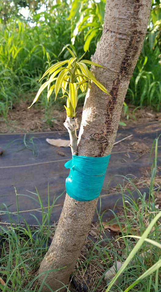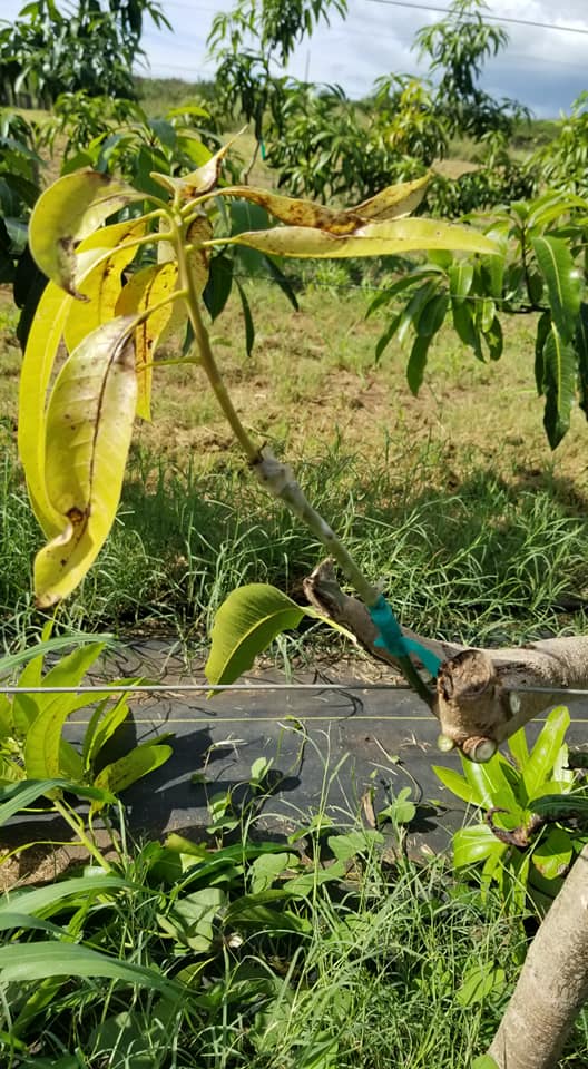Year one began by starting 600 seedlings of "common" mango. This mango is polyembrionic, meaning one seed will produce between one and ten seedlings. Polyembrionic seeds are also clonal, in that they are identical, which will give the orchard uniformity because all the seedlings are the same. "Common" mango seedlings take from 10 to 18 months to get big enough for grafting. Six varieties were selected for propagation; four commercial varieties (Rapoza, Nam Doc Mai, Kiett, and Manzanillo) and two local varieties (Haden and Pirie). Grafting was used for propagation; cleft grafting was used if the scion wood matched the rootstock and side grafting was used if they were different sizes. Both methods produced excellent results. Grafting began after the flowering season, which in Hawaii is about March, and continued from March to September, until there was 350 grafted mango trees. Here is a video on grafting mangoes.