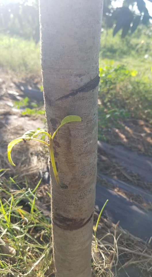 responsibility over the next year is to train and prune the trees to get the desired shape. The first goal is to set a single trunk at 30 to 36 inches. Trees are staked up as needed and flowers are removed so the trees can focus on vegetative growth. Suckers appearing below the graft point or out of place are removed as soon as possible. At this point the tree will flush with new growth and this must be thinned to two, three, or four shoots that will be trained to establish the scaffold branches. The scaffold branches will provide the main shape and support for the canopy. As the scaffold branches are forming it is important to choose branches that are evenly spaced at a 45 degree angle. if the branch is to horizontal it will bend down to the ground when set with fruit or it will not be able to support the weight and break. The branch will then flush new growth, after the third flush it should be between 18 inches to 30 inches. At this point, the terminal bud is removed, which will force multiple buds to flush, thickening the canopy. This brings the height of the tree to five feet. the most developed trees in this field are now at this stage. The majority of time is spent maintaining the ground cover and weeding around the trees, walking the field, pruning and training branches.