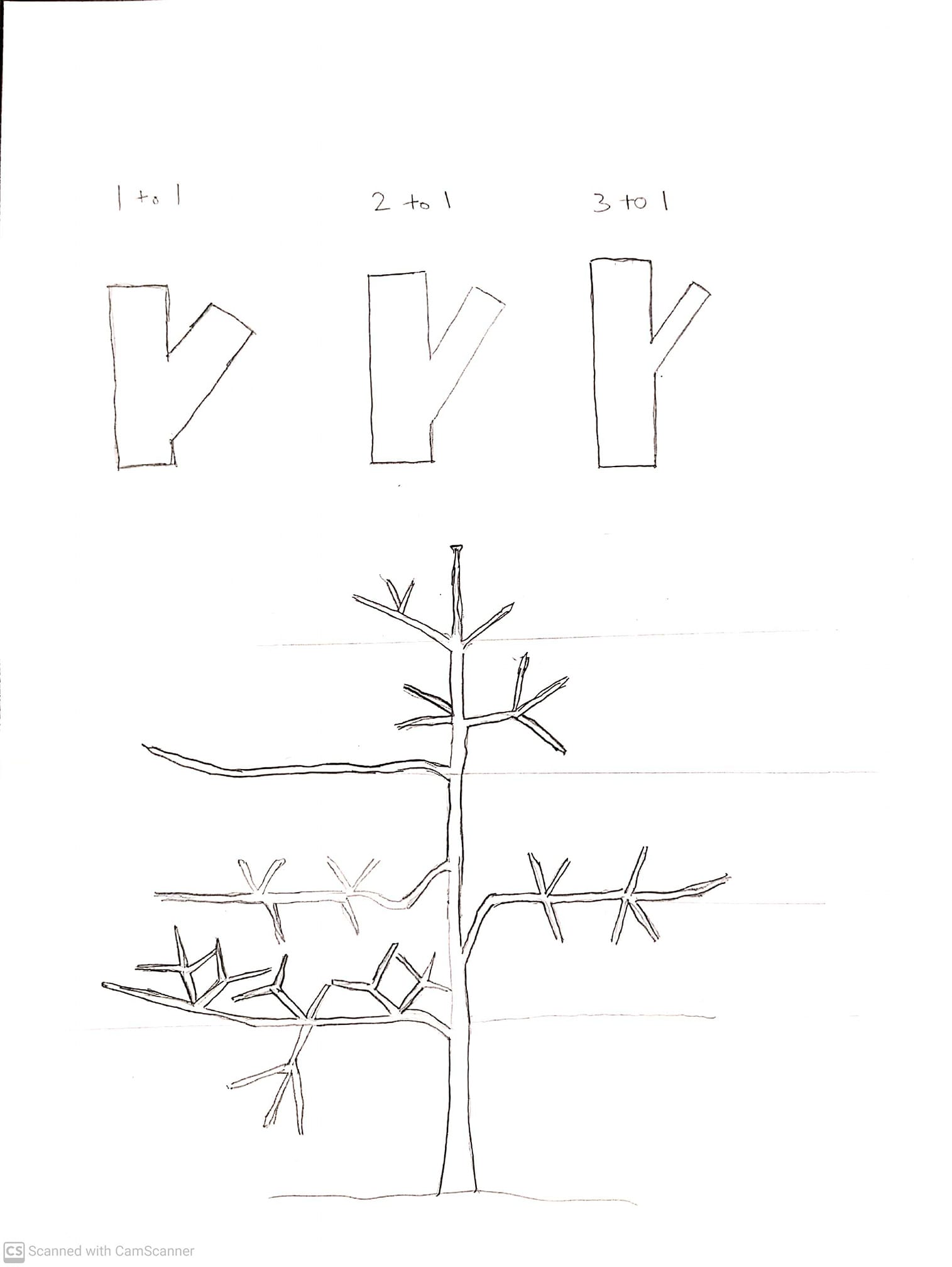 3 to 1 rule. The three to one rule says; the selected shoot to grow laterally along the wire should be 1/3 the size of the main trunk. This is easier said than done, but it is a good rule to follow. It is usually best to cull the most vigorous shoots and branches because they will compete for dominance with the leader, increasing the overall vigor of the tree. The diagram of the tree showing the central leader shape and different ways the laterals grow out. the bottom left lateral branch shows optimum development, except for the downward pointing shoot, with sub-laterals every few inches providing lots of flowering wood. The lateral third up from the bottom is an example of a lateral branch that grew out without any sub-lateral development. Some mango varieties will only flush from the terminal bud and wont have any side shoots, these trees need to be pruned at every flush to ensure adequate sub-lateral development.