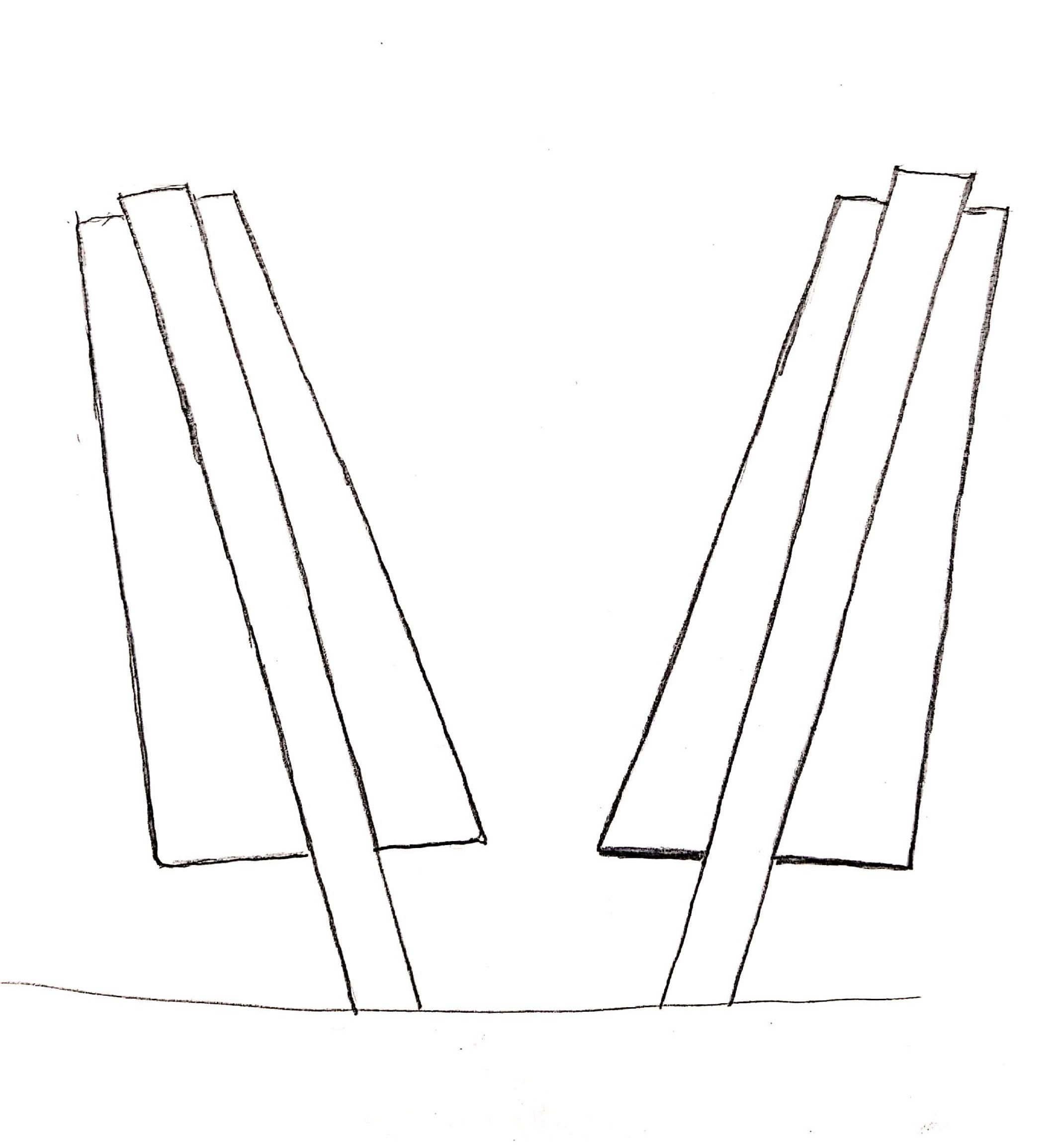 The open tatura trellis system is a "V" style trellis with a 20 inch "open" gap between posts, this is an adaptation from the original design, and it allows the farmer to walk in between the rows. The posts are set at a 72 degree angle, which has been determined to be the best angle for optimal light interception, or the percentage of light that is absorbed by the canopy of the tree, from the bottom of the tree to the top. Seven pairs of treated pine posts were used for each row. 5" by 10' posts and 3 1/2" by 10' posts were alternated in each row and set 40 feet apart. 45 feet should be the maximum span between posts. Posts were set 24 inches deep, with the tops of the posts being eight feet above the ground. The post holes were dug with a gas powered ground drill and that was essential for the job, hand digging the holes would be very labor and time intensive. Making a template to follow when auguring the holes is essential to getting the right angle when setting the posts. 2" x 4" x 8' cross pieces were added to the top of the posts for stabilization.
