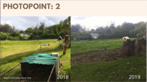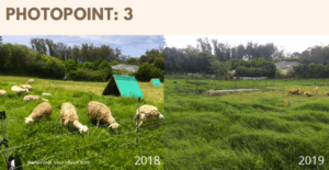 Photopoint 1 is the region where we measured Sheep + Chicken impact. Unfortunately, where we layed out the location for the Sheep + Chicken zone also happened to receive full shade for 4 months in the winter. We had a severe, extended rain event during the winter and the pasture was mucked up and denuded in this area because the shade had weakened the grass. When the animals came through they trampled and mucked up the land. However, even with all of that impact, the land still appears improved and healthy in the 2019 photo. Also, of interested, the disturbance caused a large number of forbes (some native) to establish in this area.