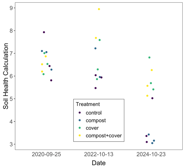 Figure 10. Haney Soil Health Calculation by compost and cover crop treatment combinations (point colors) at baseline (2020), after 1 year (2022), and 3 years (2024) of treatment implementation.