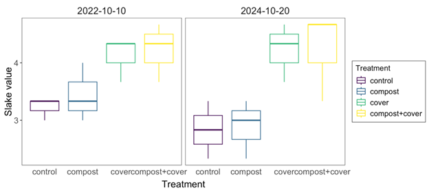 Figure 7. Slake test (median = thick line, interquartile distances = box, 95% range = whiskers) by compost and cover crop treatment combinations after one year (2022) and three years (2024) of treatment implementation.