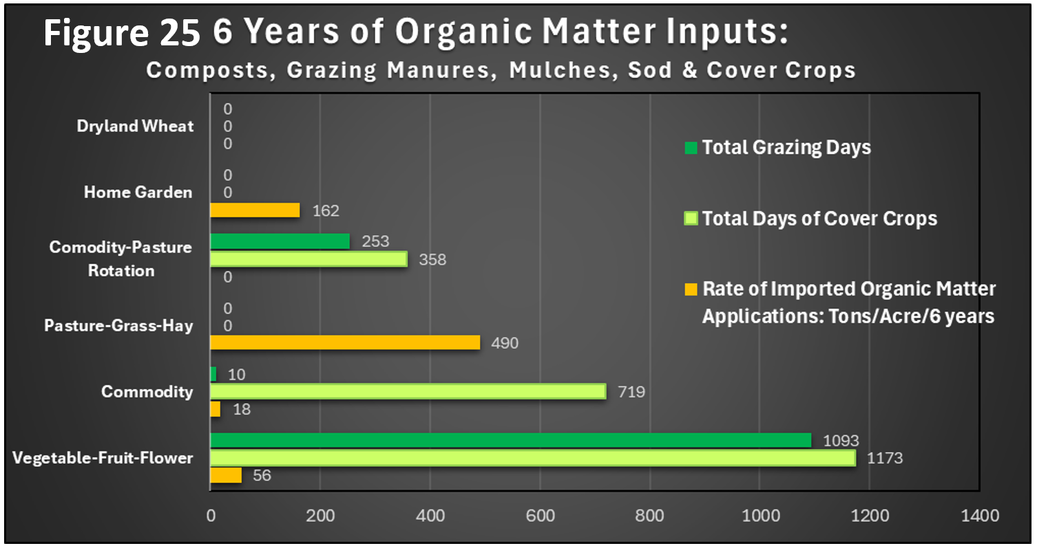 Commodity Row Crops : The Commodity crop group had the lowest average scores of these three groups. Although they had done an excellent job of reducing their tillage intensity, that fact alone could not make up for their high soil pH, lowest days of living cover and lowest organic matter added. They had only 2/3rds of the water availability as the Commercial Veg/Flower/Fruit group, which explained their lower days of cover crops that often require fall seeding and fall water. Inter-seeding cover crops aerially or when the main crop is still small were work-a rounds but not always practical. Low commodity prices meant the cost of additional organic matter inputs like compost and manure were hard to justify.