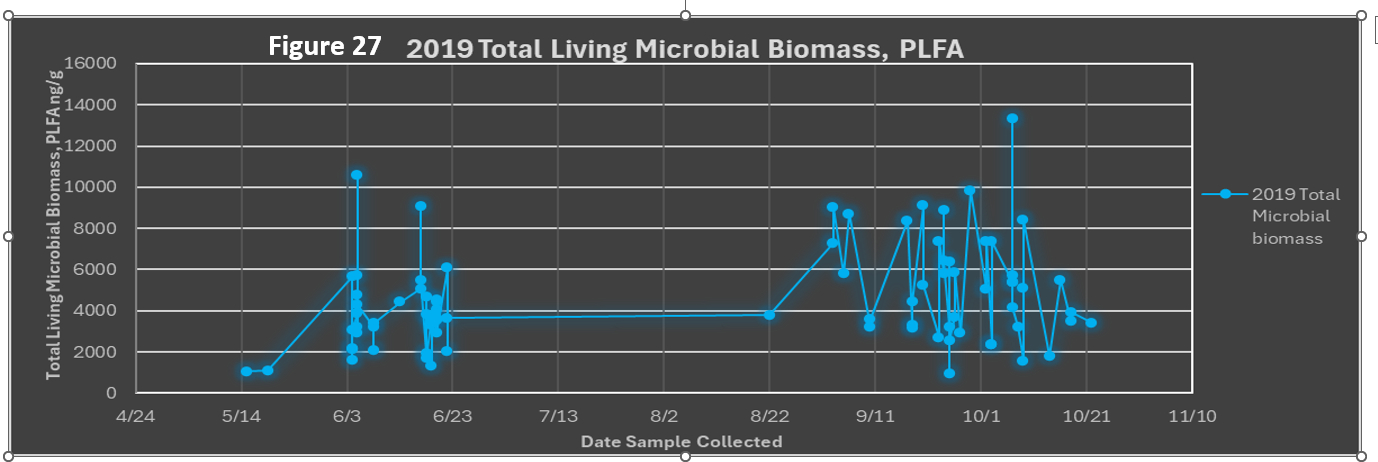Figure 29 shows our sites’ total microbial biomass in 2023. This graph shows the same wide range of scores in the spring, but suddenly in the fall, all sites have very low scores.