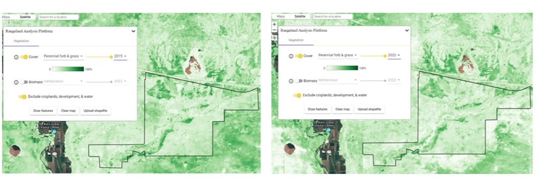 The Rangeland.ap shows how the coverage within the property was almost as good in 2020, after 3 years of severe drought (parts of the ranch got 8in in those three years combined, when the average rain is supposed to be 12 in a year), than it was in 2015, when the yearly rain was 20 in, while the country in neighbors’ ranches showed poor coverage in 2020.
