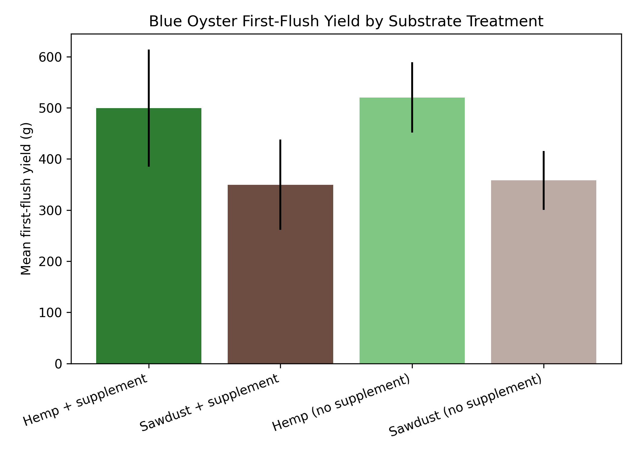 Across treatments, hemp substrates yielded approximately 45 to 50 percent more mushroom biomass per bag than sawdust substrates. In addition to higher mean yield, hemp treatments exhibited lower inter-bag variability, particularly in the non-supplemented hemp group (standard deviation 68.8 g) relative to supplemented sawdust (standard deviation 88.5 g).