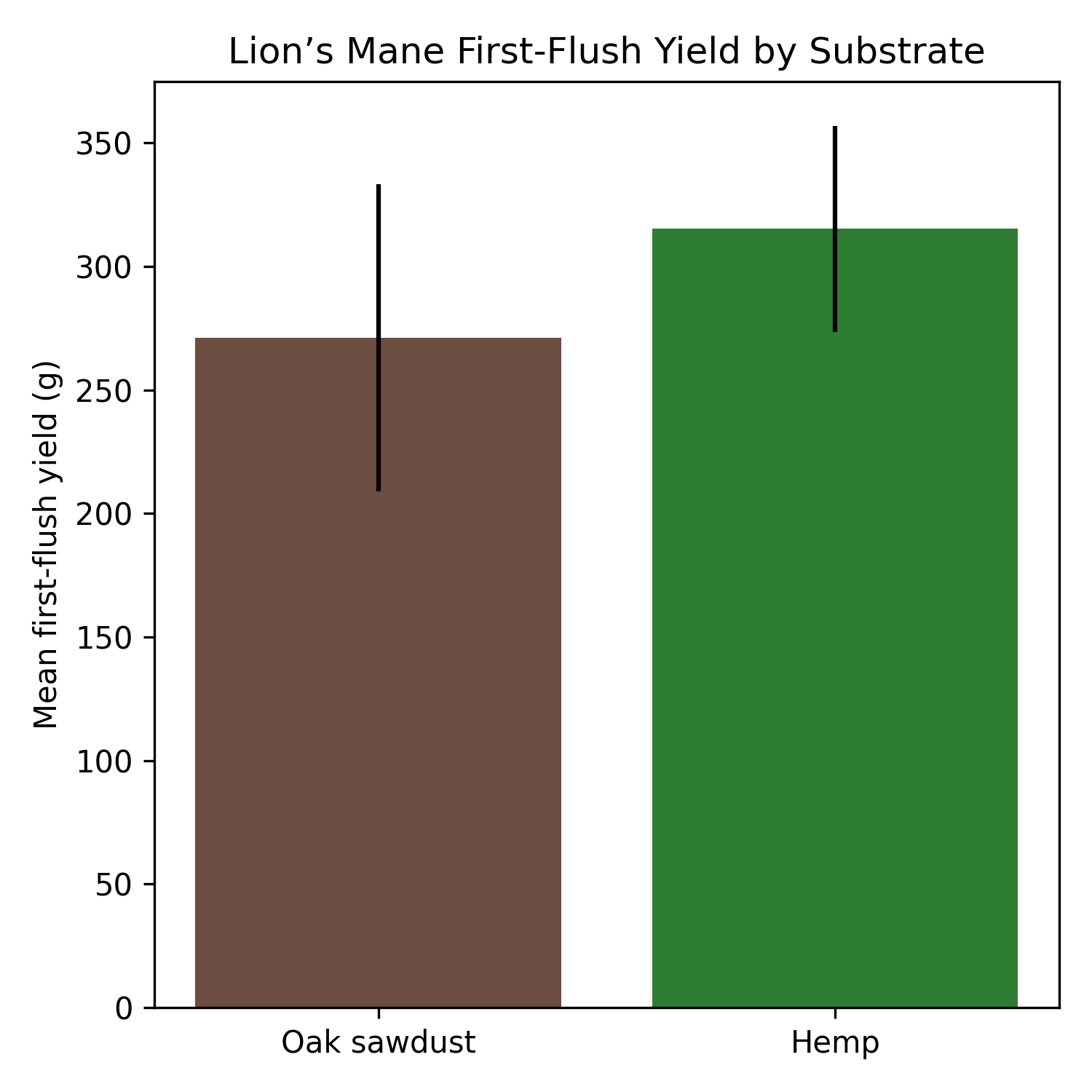All 64 lion’s mane substrate bags produced measurable first-flush yields (32 bags per substrate type). Hemp substrates again outperformed sawdust, with higher mean yield and reduced variability (Table 2). This pattern is shown in Figure 2.