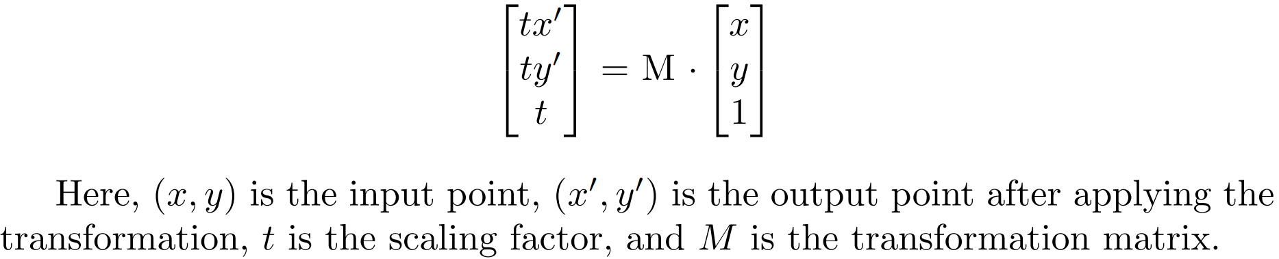 Mathematically, perspective transform is a linear transformation obtained by multiplying the input points with a transformation matrix as shown below.