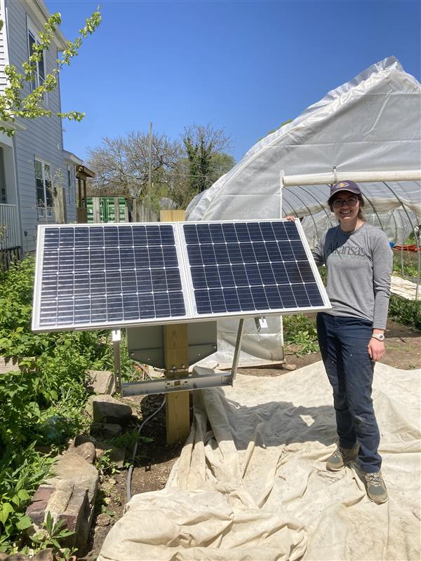Our urban farm partner operates on a few different parcels of land, and not all of them have electricity. The site where we located the geothermal heat exchange system didn't have power, so a registered student organization from the Ohio State University - Students for Sustainable & Resilient Communities - helped size, site, and install a solar panel and battery system to run the fan for the system, shown in Figure 4.