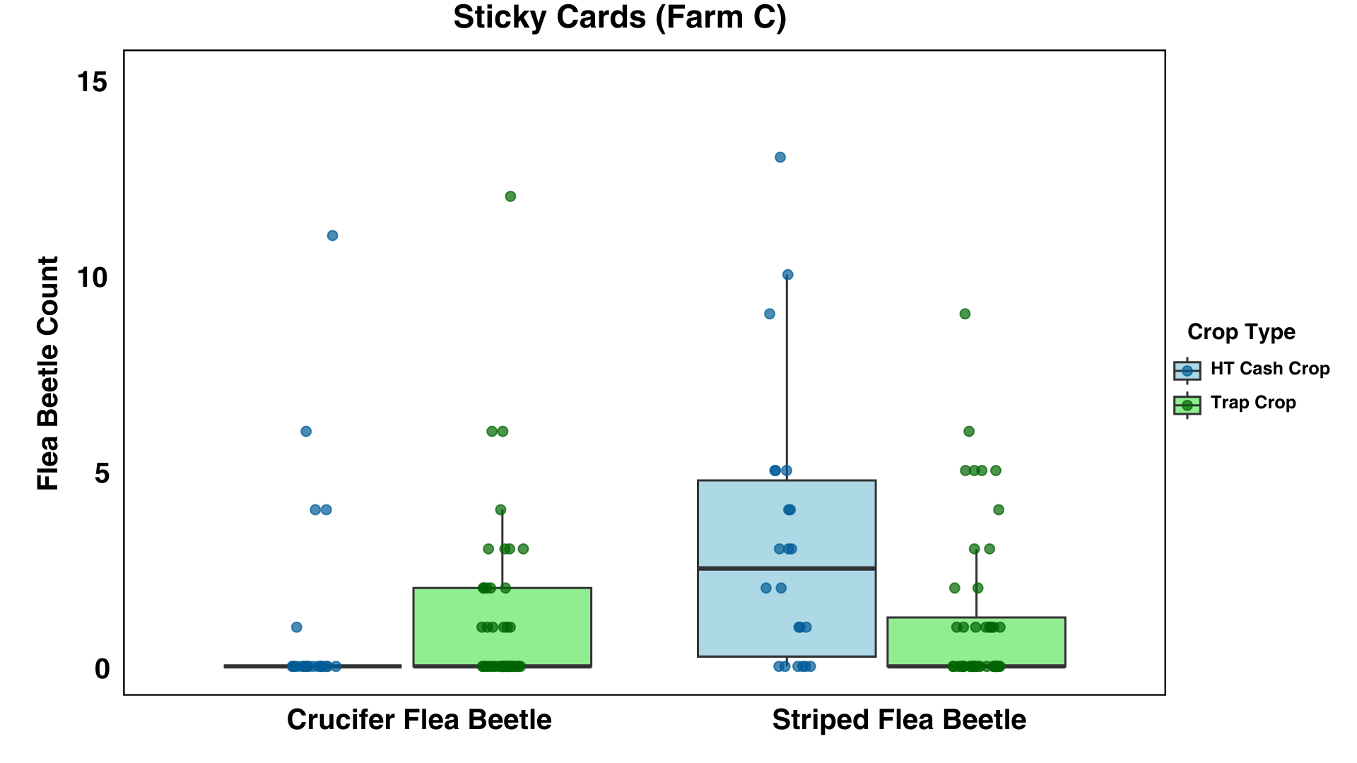 Farm C: On Farm C, there were no statistically significant observed differences between beetle counts or sticky card captures in the brassica trio trap crop rows or the cash crops in the high tunnels (Figures 18 and 19).