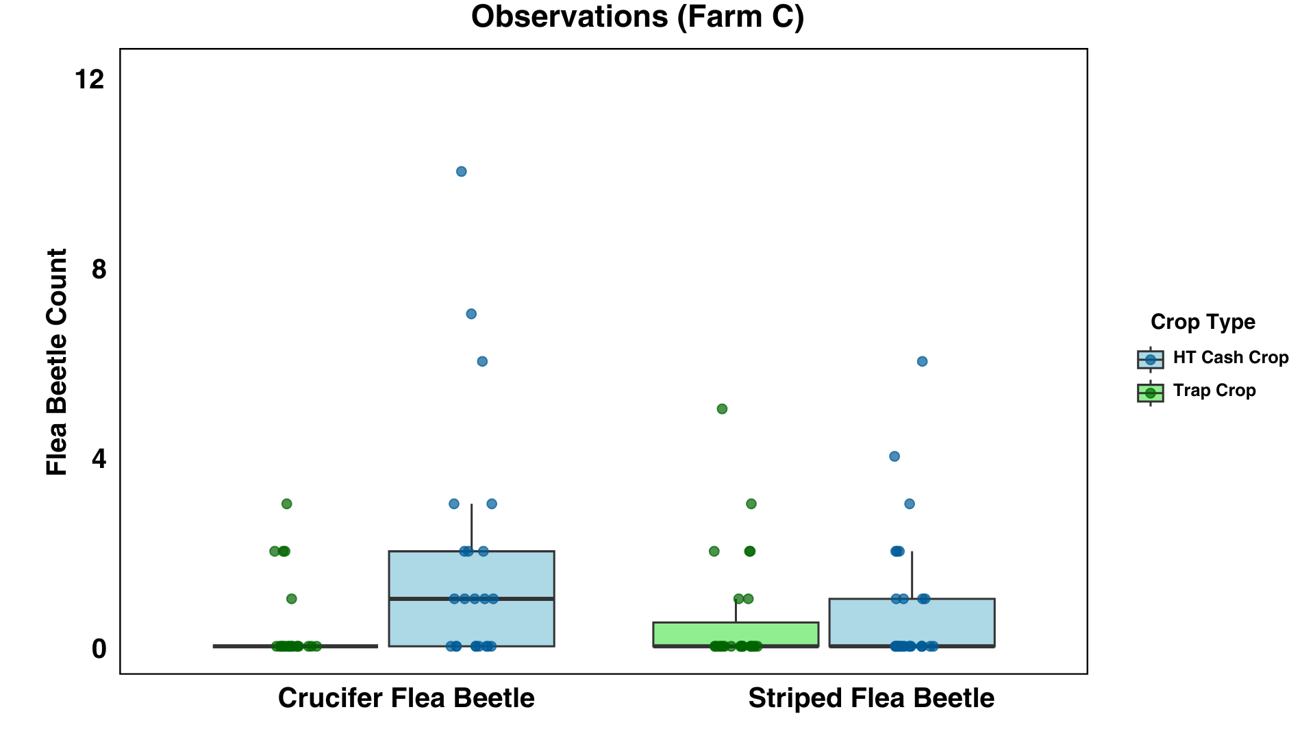 Farm A: Data were analyzed using Poisson GLMM with sample location and date as random effects. The flea beetle population, which was sampled by sticky cards and through visual observations, was mostly composed of the striped flea beetle, Phyllotreta striolata. Significantly fewer crucifer flea beetles were collected on sticky cards in arugula alone than either arugula with a trap crop or the trap crop alone (p = 0.001). Significantly fewer striped flea beetles were collected on sticky cards in arugula (p ≤ 0.024), and the arugula with a trap crop had significantly more beetles than the trap crop alone (p = 0.0002), (Figure 13). Flea beetle counts differed by crop and species, with both crucifer and striped flea beetles significantly more abundant on the trap crop than Arugula (p = 0.001). The interaction between plant type and beetle species was also significant (p = 0.03), (Figure 14). Arugula in high tunnels without the trap crop had significantly fewer shotgun feeding damage holes than arugula with the trap crop (p<0.0001), (Figure 15).
