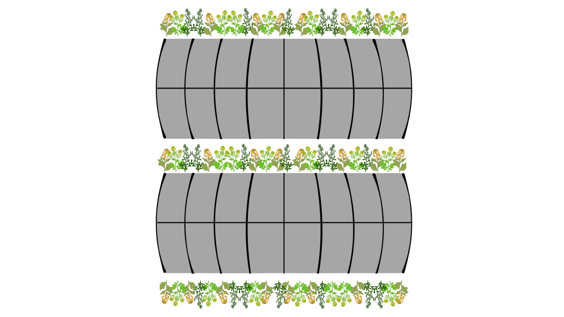 Both high tunnels, situated adjacent to each other with 3 meters between them, were used for the experiment. Brassicas were grown in polyculture in both tunnels during the growing season. In the last week of April, two rows of the Brassica Classic Trio Mix were seeded on each side of the high tunnels, and two rows were seeded in the middle (Figure 5).