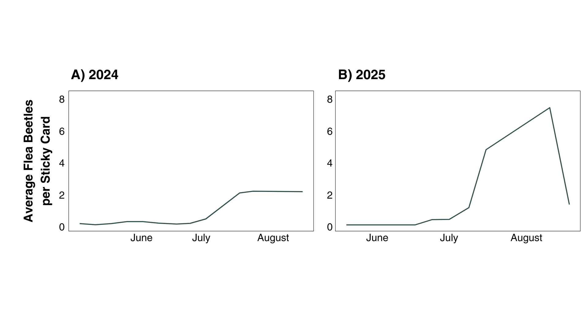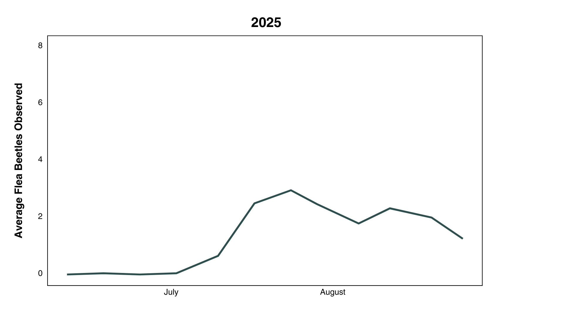 1.2: Flea beetle populations at the research farm were very low in both 2024 and 2025, despite introduction of collected flea beetles in 2025. Specifically, these numbers were very low during the spring, when an EPN treatment would be most effective, able to target soil-dwelling larvae that are the offspring of the overwintering generation. Populations increased in August, suggesting that second generation adults were entering the cropping system from other parts of the farm (Figures 8 & 9).