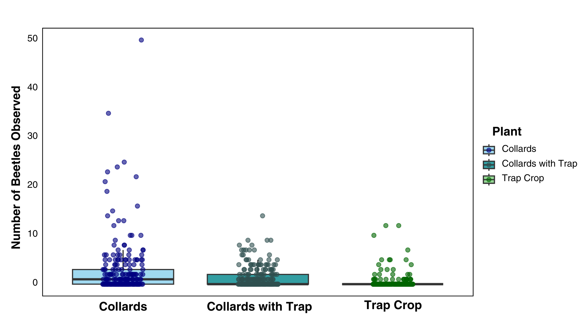 Data collection occurred weekly for the duration of the experiment. First, yellow sticky cards were set in each cash crop plot at plant height (four per tunnel), replaced weekly. Tunnels with trap crops also had four sticky cards placed in the trap crop. Relevant insects on yellow sticky cards were identified to family, and all flea beetles or other Brassica feeding insects were identified to species. Timed visual observations counted the number of flea beetles observed per collard crop plot per tunnel recorded in one minute. For tunnels with a trap crop, 1-minute observations were taken in the trap crop row as well. In 2025, observation data was expanded to include four observations per tunnel: one in each collard plot, and four in each trap crop row.