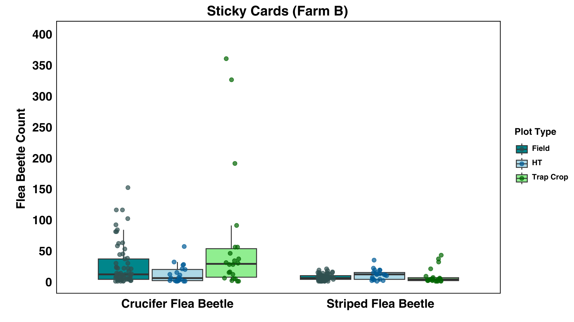 There was a trend for fewer crucifer flea beetles to be observed in the high tunnel than in the field plots or the trap crop, but differences were not statistically significant (Figure 16). Significantly more crucifer flea beetles were captured on sticky cards in the trap crop than in the high tunnel (p <0.001), but there was no significant trend for the striped flea beetles (Figure 17).