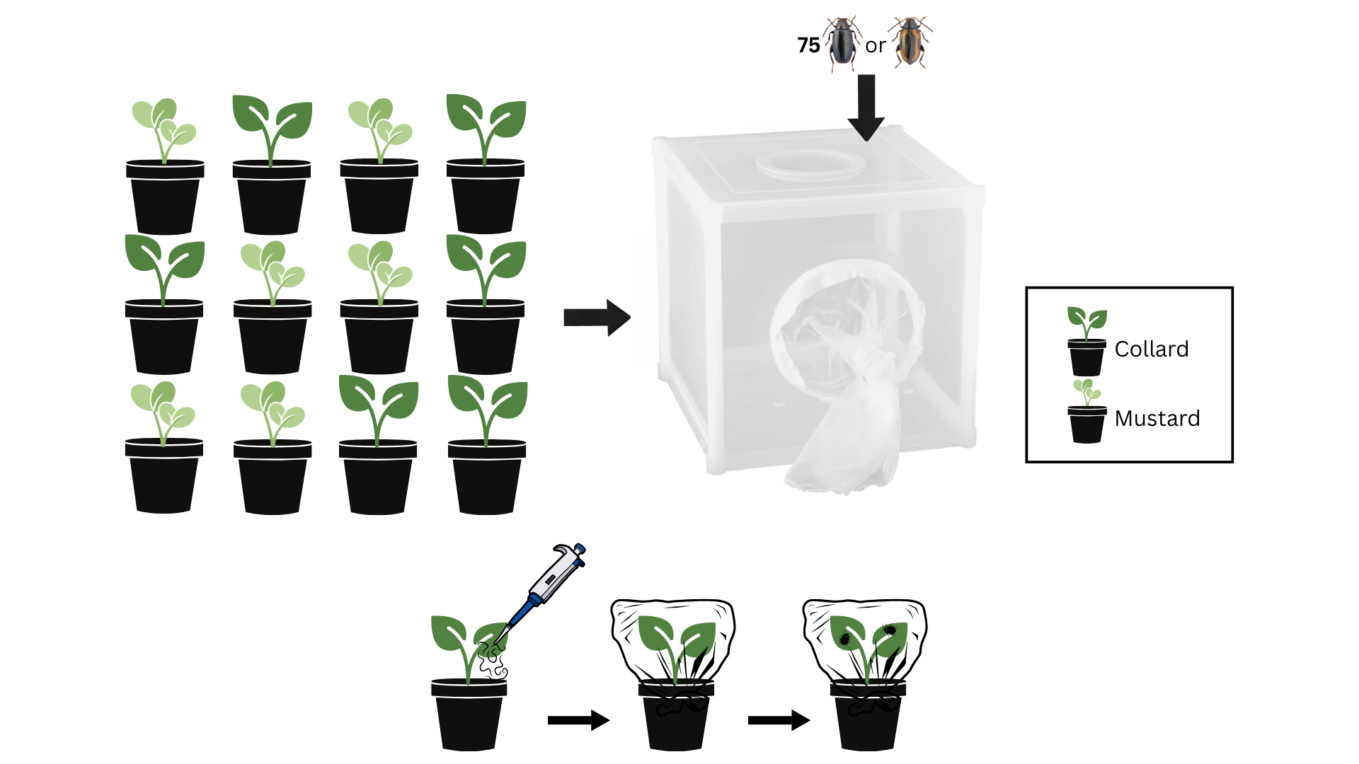 Flash collards (B. oleracea) and Pacific Gold mustard (B. juncea) were seeded in the greenhouse. When plants were approximately 4 weeks old, they were transplanted into 4-inch round pots filled with potting medium (Berger BM7 Bark Mix; Berger, Saint-Modeste, QC, Canada). Pots were labeled with plant type, EPN treatment, and time duration (Table 2). 12 plants (one of each treatment combination) were randomly placed per BugDorm, with 6 total Dorms used. 75 field collected flea beetles were placed in each bug dorm. 3 Dorms contained Phyllotreta striolata, and 3 contained P. Cruciferae (Figure 1). BugDorms containing plants and beetles were kept under greenhouse conditions and pots were be watered as needed while minimally disrupting plants and soil. Adult beetles were left to feed and oviposit in the pots.