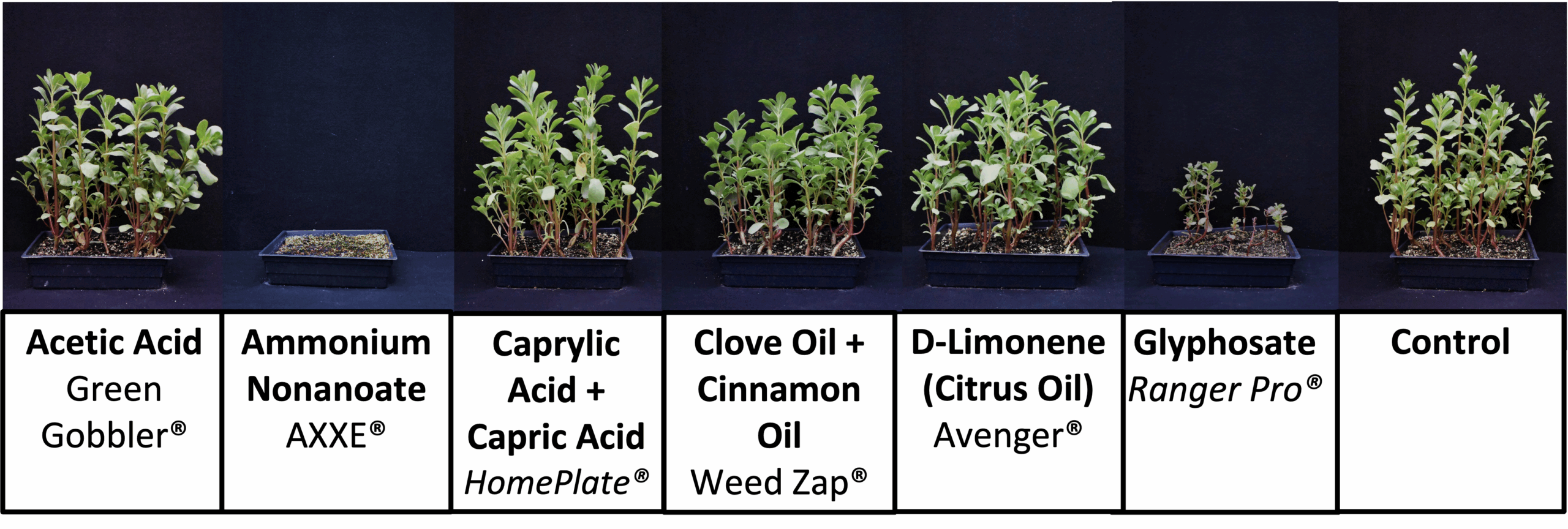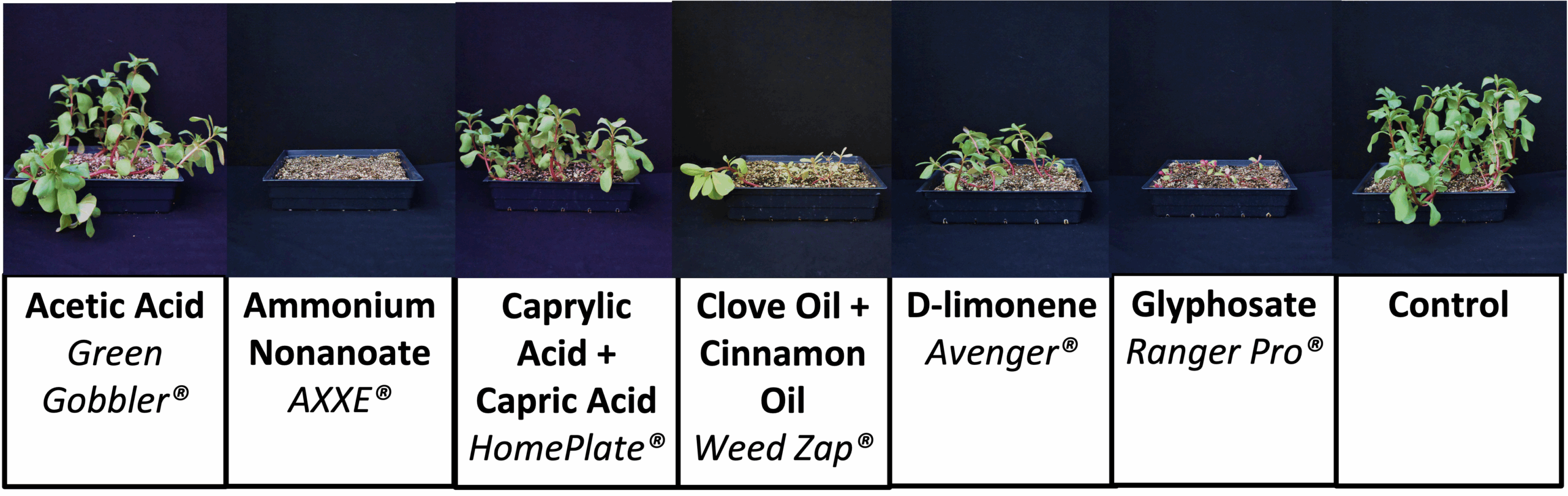 Five Organic Materials Review Institute (OMRI)-approved products were trialed in this experiment: Avenger® (citrus oil), AXXE® (ammonium nonanoate), Green Gobbler® (acetic acid), HomePlate® (caprylic acid + capric acid), and Weed Zap® (clove oil + cinnamon oil). Water was used as a control, and Ranger Pro® (glyphosate) was used as a positive control. Each herbicide was tested on five common weed species: Portulaca oleracea (common purslane), Setaria viridis (L.) Beauv. (green foxtail), Digitaria sanguinalis (L.) Scop. (large crabgrass), Amaranthus retroflexus (redroot pigweed), and Abutilon theophrasti (velvetleaf). Products were sprayed according to label recommendations using a calibrated spray chamber at the Iowa State University greenhouses. The efficacy of herbicides was evaluated in three ways: percent visual injury, digital images analyzed with Turf Analyzer to find percent green cover, and dried weed biomass 21 days after treatment.