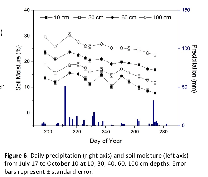 Over the course of the season, soil moisture consistently increased with depth (Pdepth <0.001) and fluctuated with rainfall events (Pdate < 0.001), including during a brief dry-down period in September (Figure 6).