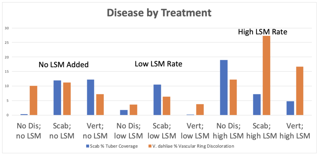 1. Greenhouse Trial Results. In the initial greenhouse trial, the aboveground biomass of potato plants increased significantly with increasing rates of LSM, regardless of if plants were inoculated with a fungal or bacterial pathogen, or not inoculated at all (p=2e-16; Figure 1). However, the highest aboveground biomass was seen in non-inoculated plants with the highest rate of LSM. The number of tubers was not significantly different between treatments, but this could also be an artifact of the small volume of soil in which the plants were being grown (p=0.26; data not shown). Plants that were not inoculated grew taller overtime when amended with the highest rate of LSM, as is seen in Figure 2 (p=4.11e-7). Disease severity was inconclusive from this initial greenhouse trial and no significant differences were seen in pots inoculated with V. dahliae or S. scabies (p=0.152 and 0.251, respectively); however, one trend was noticed. While not significant, disease severity overall was lowest in the treatments which were amended with the lower rate of LSM compared to non-amended or the higher rate of LSM. Severity of PED, as measured by the percent of the tuber vascular ring which was discolored, was also not significantly different (p=0.967). Scab severity was not significantly different, but the lowest rate of LSM had the lowest severity numerically, regardless of treatment (p=0.669; Figure 3).