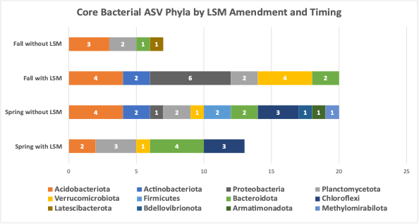 3. Lobster shell meal effects to soil microbial communities in the field. Over both fall and spring amended trial samples, 9,180,019 bacterial sequences were delivered which resulted in 6,049 bacterial ASVs across 155 samples. Within the fungal sequences, 3,028,243 reads were delivered, resulting in 14,246 ASVs across 155 samples. In spring-LSM-amended soils, microbial community diversity metrics, including observed ASVs, Shannon diversity index, evenness, and richness indicators ACE and Chao1, were not significantly different for soil bacterial communities among treatments. Fungal Shannon diversity was significantly different among soil treatments and was the lowest in soils amended with LSM and highest in the unamended, uninoculated treatment (Table 2). Within bacterial communities in soils amended with LSM in the spring, 127 ASVs were core with LSM, and 135 ASVs were core without LSM amendments (Table 3). By excluding ASVs which were common core members, and likely represented simply common soil microorganisms, 13 were conditionally core to LSM amended soils only and 20 were conditionally core to soils without LSM amendment. Of the top three bacterial phyla of ASVs which were conditionally core with LSM amendment, 30.7% were in the phylum Bacteriodota, followed by 23.1% Chloroflexi, and 23.1% Planctomycetota (Figure 6). The top two bacterial phyla which were conditionally core without LSM amendment, were Acidobacteriota and Chloroflexi (20% and 15%, respectively; Figure 7). For fungal core communities, 79 were found to be core with LSM amendment, and 78 were core without LSM amendment. After common core fungal ASVs were removed, 4 remained as conditionally core to LSM amended treatments, and 6 remained conditionally core to that without LSM amendment (Table 3). Of those fungal ASVs which were conditionally core with LSM amendments, three were unidentified, but one was identified by FungalTraits as a litter saprotroph. Of the fungal ASVs which were conditionally core without LSM, two were unidentified, two were saprotrophs, one was a plant pathogen, and one was an animal parasite. In spring amended treatments, only one bacterial ASV was more abundant with LSM amendment and was identified in the order Solirubrobacterales and family 67-14 and one fungal ASV was more abundant with LSM and was identified to the family Nectriaceae.