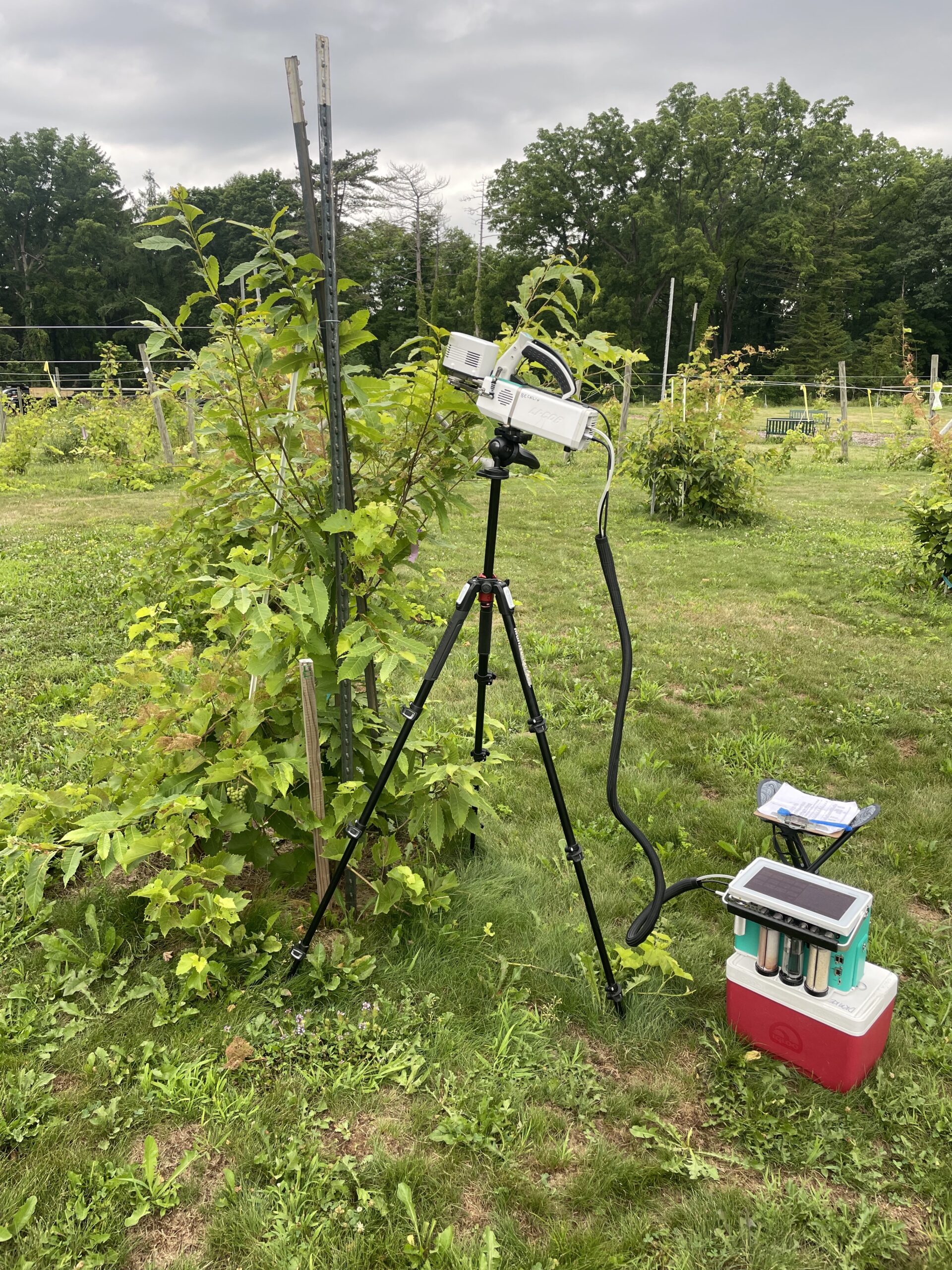 I propose to utilize a pre-existing unique experimental platform to test the relative benefits of co-cultivation relative to traditional monoculture in field conditions. Species interactions in co-cultivated settings can result in benefits to one or both species via facilitation or reductions in performance via competition. The degree of facilitation versus competition is likely to be density-dependent. The SUNY ESF Grape and Chestnut Co-Cultivation study, established in 2020, allows for testing of these interactions through a traditional agroforestry vineyard schema in which three plots, each containing nine trees trellised with varying densities of grapes, border a square crop field. Transgenic American chestnuts are planted alongside grapevines at densities of one, three, and five vines per tree, with nearby, non-paired chestnuts and grapes serving as monoculture controls (Figure 1 in Media). The physiological assessment of the chestnut trees will include LI-COR LI-6800 system measurements of light saturated photosynthetic rates, stomatal conductance, and leaf water potential across each grape planting density. A complementary growth assessment within this experiment will measure grape harvest yield and tree basal diameter and height to determine how the measured physiological processes may be influencing biomass acquisition and allocation, and whether co-cultivated crops may be facilitating or impeding the productivity of the other compared to monoculture plantings. We will not measure chestnut harvest yield, as the four-year-old chestnuts are unlikely to reach reproductive maturity by the conclusion of this study.