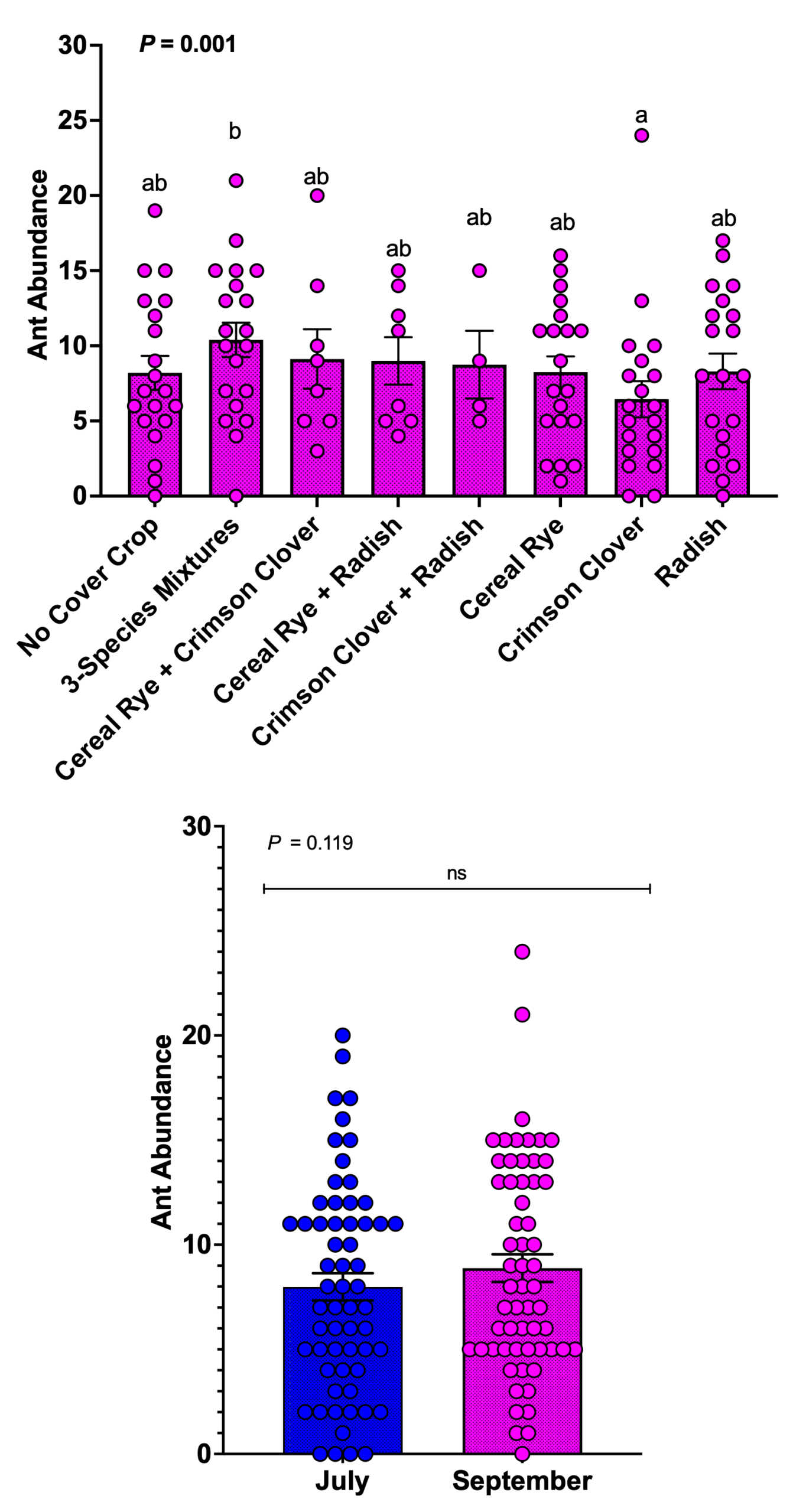 Cover crop treatment significantly affected ant abundance in pitfall traps (P = 0.001). The three-species mixture supported the highest ant abundance and differed significantly from crimson clover alone. Most other cover crop treatments supported intermediate ant abundance and did not differ from one another or from the no-cover control. Contrary to our hypothesis, the no-cover control did not support the lowest ant abundance; instead, crimson clover alone supported fewer ants than several other treatments. These results indicate that cover crop identity, rather than the presence of cover crops alone, influences ant populations. Month did not affect ant abundance (P = 0.119), and ant activity in pitfall traps remained stable between July and September.