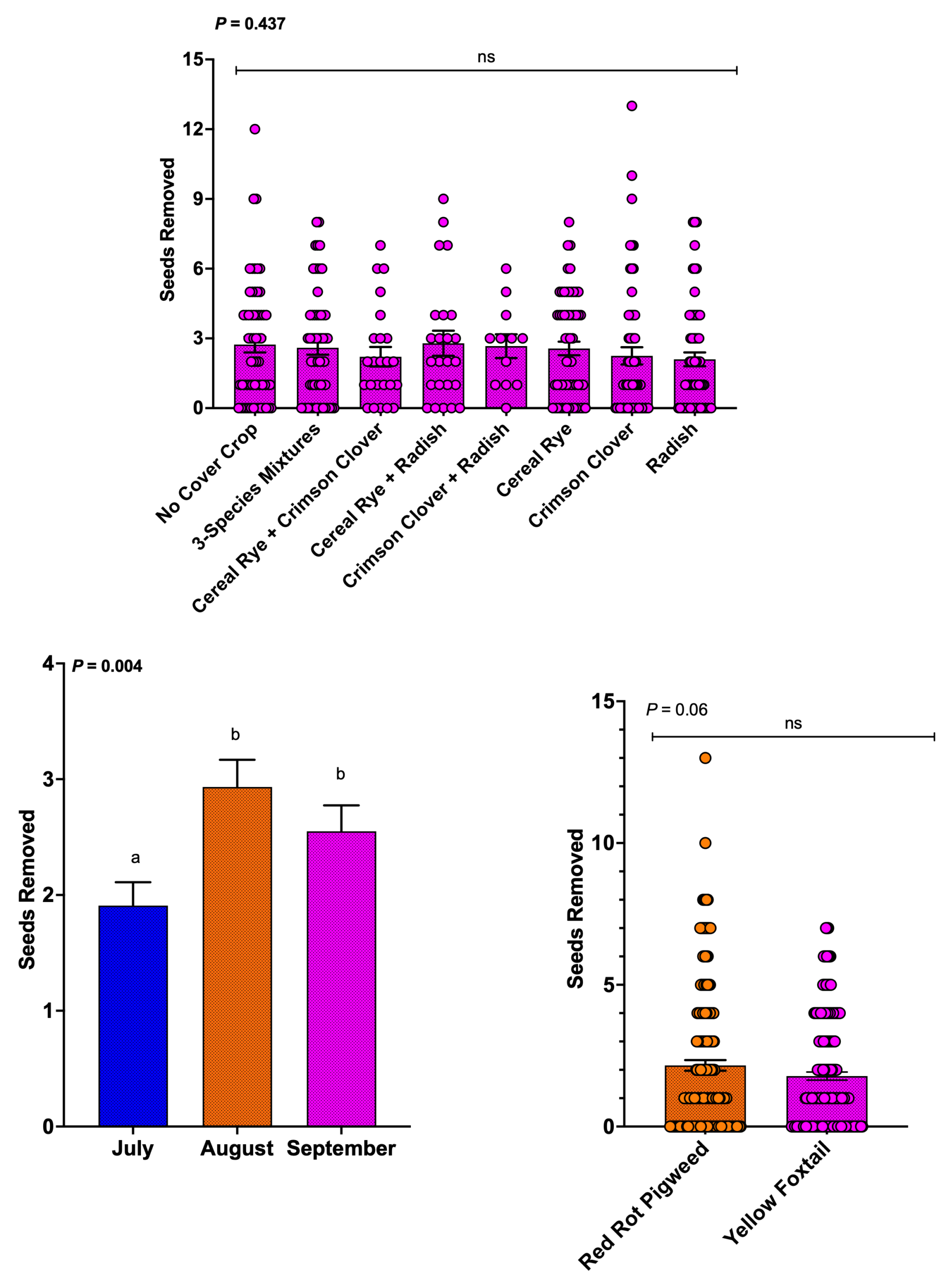 Cover crop treatment did not affect weed seed removal (P = 0.437). All treatments showed similar levels of seed predation. This lack of a treatment effect was unexpected, as we hypothesized that cover crops supporting higher ant abundance would also support greater seed removal.