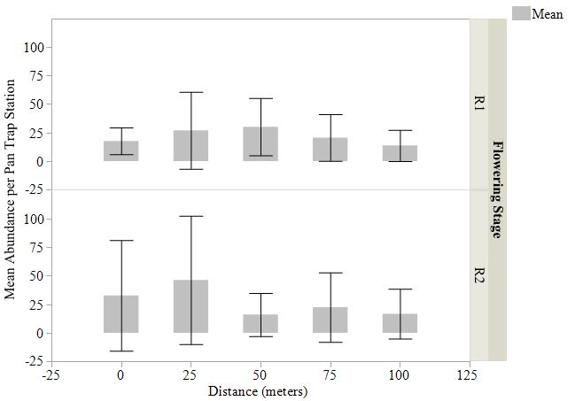 Mean abundance of bees captured by pan traps, blue vane traps, and sweep net transects were not statistically different (Fig. 4, 5, 6) at varying distances into soybean fields at R1 and R2 reproductive stages. The variation around the means was high due to the differing individuals captured at each site and should be considered. We detected bees moving up to 150 m into the soybean fields beyond the wetland edge. Per trap type, the most bees were captured in pan traps (1,785 individuals, 31 species), blue vane traps (294 individuals, 26 species), and sweep nets (65 individuals, 11 species) in soybean fields (Table 2).