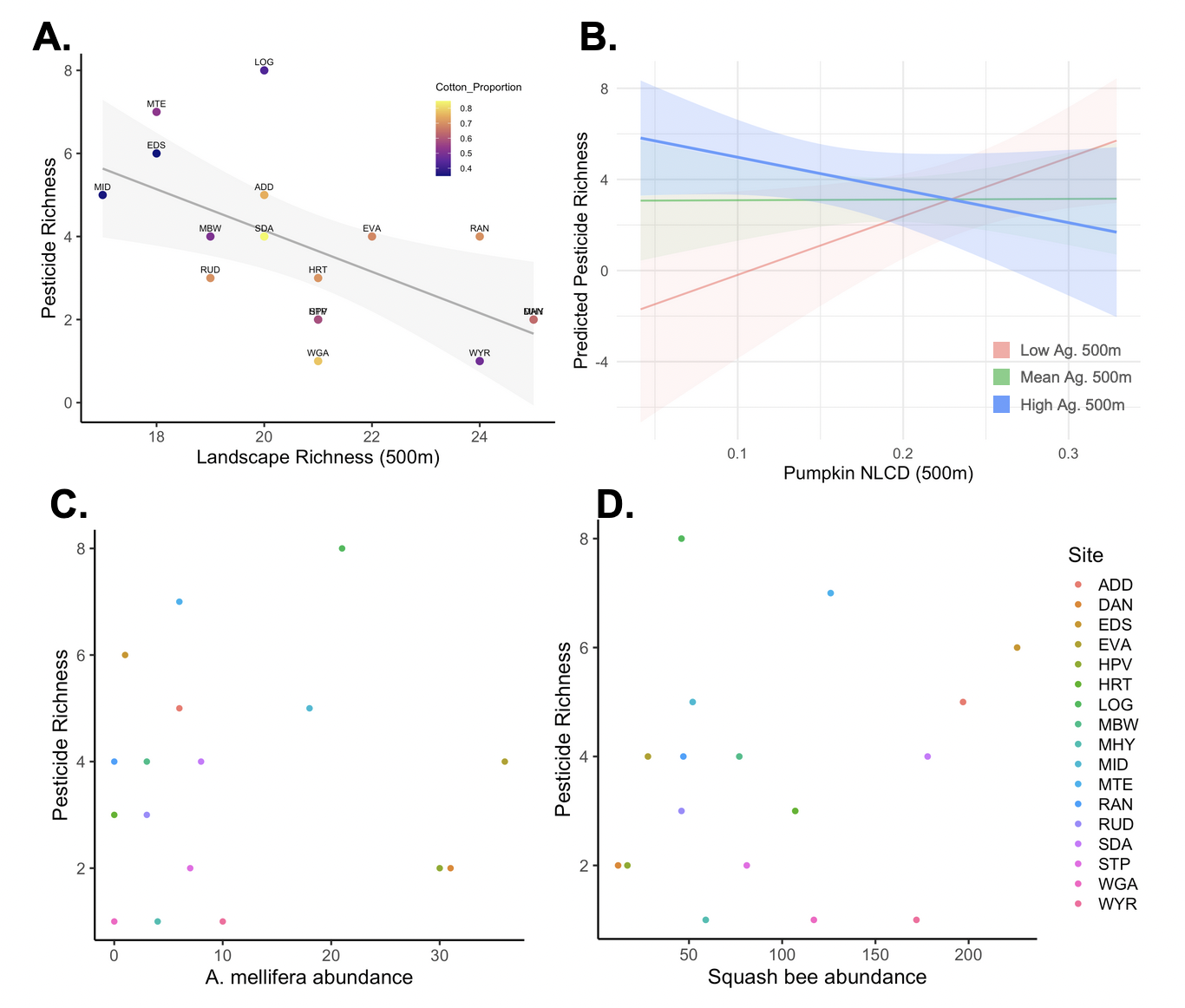 We are finding that the surrounding landscape composition is important in predicting how many pesticides we detect in the soil, and the cumulative toxicity of those pesticides (measured in hazard quotient based on honeybee LD50 data available through the EPA ECOTOX database). Landscapes with more landcover categories 500m surrounding the site (landscape richness) have fewer pesticides detected (pesticide richness) (Fig. 1A). We also found an interaction between the amount of surrounding agriculture and amount of surrounding pumpkin 500m around a site, when surrounding agriculture is low we are finding that more surorunding pumpkin predicts more pesticides but that when surrounding agriculture is high more surrounding pumpkin predicts fewer pesticides detected in the soil (Fig. 1B).