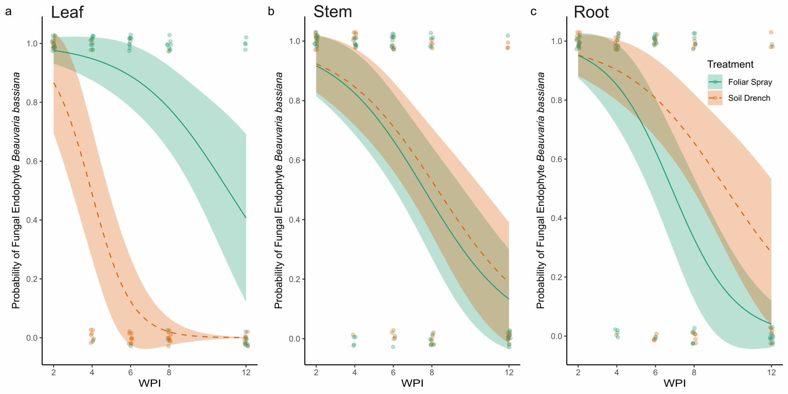 At two WPI, all sampled tissues (leaves, stems, and roots) from both foliar-sprayed and soil-drenched plants tested positive for endophytic colonization by B. bassiana (Figure 2). Over time, the probability of recovering B. bassiana from leaf tissues was higher in foliar-sprayed plants compared to soil-drenched plants (Figure 2A). In soil-drenched plants, recovery from leaves declined sharply around six WPI and ceased entirely by twelve weeks (Figure 2A). In contrast, recovery from stem tissues was similar between foliar spray and soil drench treatments throughout the study period (Figure 2B). By eight WPI, the likelihood of recovery from stems was approximately 50%, regardless of treatment method (Figure 2B). For root tissues, the probability of endophytic recovery was slightly higher in soil-drenched plants compared to those treated via foliar spray (Figure 2C). Overall, the probability of recovering B. bassiana from all tissue types declined over time. However, in foliar-sprayed plants, the fungus was still detectable in representative samples of all tissue types at twelve WPI (Figure 2). There was no recovery of B. bassiana in any of the plants treated with the control.