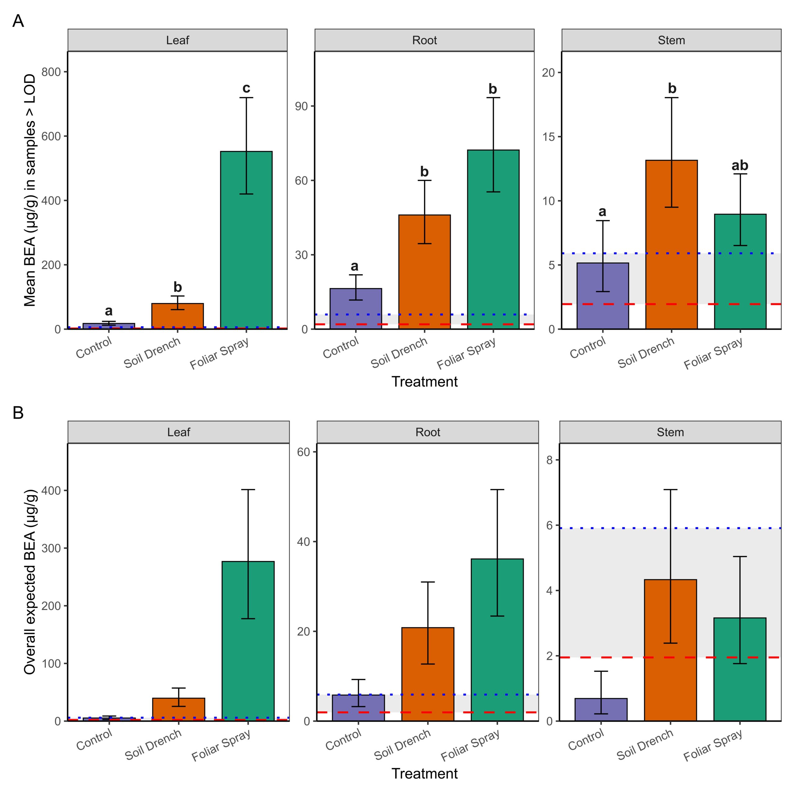 To do so we used a two-part hurdle modeling framework. The first component modeled the probability of detecting BEA above the limit of detection (LOD = 1.95 µg/g) in non-surface sterilized tissues. Detection probability did not differ significantly among Treatments (foliar spray, soil drench, control) , Tissue (leaf, root, stem), or their interaction (Anova, χ² = 4.25, df = 2, p = 0.12 for Treatment; χ² = 5.41, df = 2, p = 0.07 for Tissue; χ² = 1.39, df = 4, p = 0.85 for Treatment × Tissue; Supplemental Fig. 1). Because detectability did not differ among treatments or tissues, subsequent differences reflect true variation in concentrations rather than artifacts of threshold sensitivity.