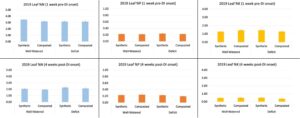 2019 and 2020 pre-planting soil fertility measurements did not reveal significant or consistent differences in nitrogen, phosphorus, or potassium however rates of increase were highest for nitrogen levels in the well-watered synthetic treatment (Fig. 11).