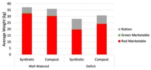 For this objective we monitored Fusarium disease development in a processing tomato cultivar grown under different irrigation and soil amendment treatments over two years. The irrigation treatments were "Well-Watered" (irrigation meeting 100% of evapotranspiration (ET) needs) or "Deficit" (irrigation meeting 60% of ET needs) as measured by a Tule system. The soil amendment treatments were "Synthetic" (180 lb N/acre) or "Compost" (180 lb N/acre with 2 tons/acre composted poultry manure). Each irrigation-soil amendment treatment was replicated three times. Leaf nutrient data was taken at the end of each growing season. Soil nutrients were measured before planting and again at harvest.