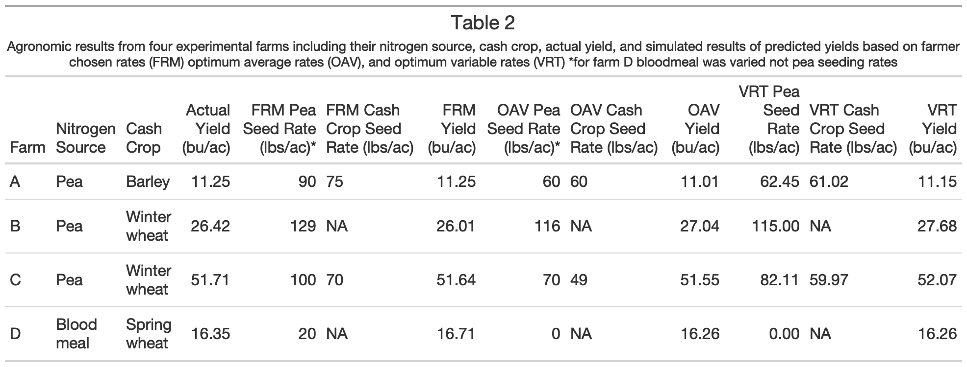 Table 2 – Agronomic results of experiments and simulations using three seeding strategies: farmer chosen rate, optimum average rate, and variable rate