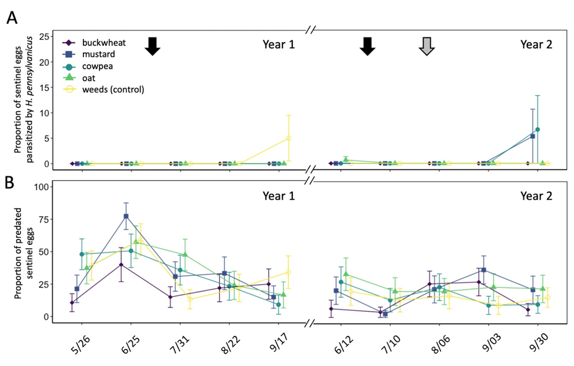 Fig. 12 Mean proportion (± SE) of sentinel Leptoglossus zonatus eggs parasitized by Hadronotus pennsylvanicus (A) or predated egg clusters (B) in pistachio canopy within each groundcover treatment. Arrows on the top indicate treatment with a pyrethrin (black arrow; 3 July 2020 & 20 June 2021) and mowing of the groundcover (grey arrow; 2 August 2021).